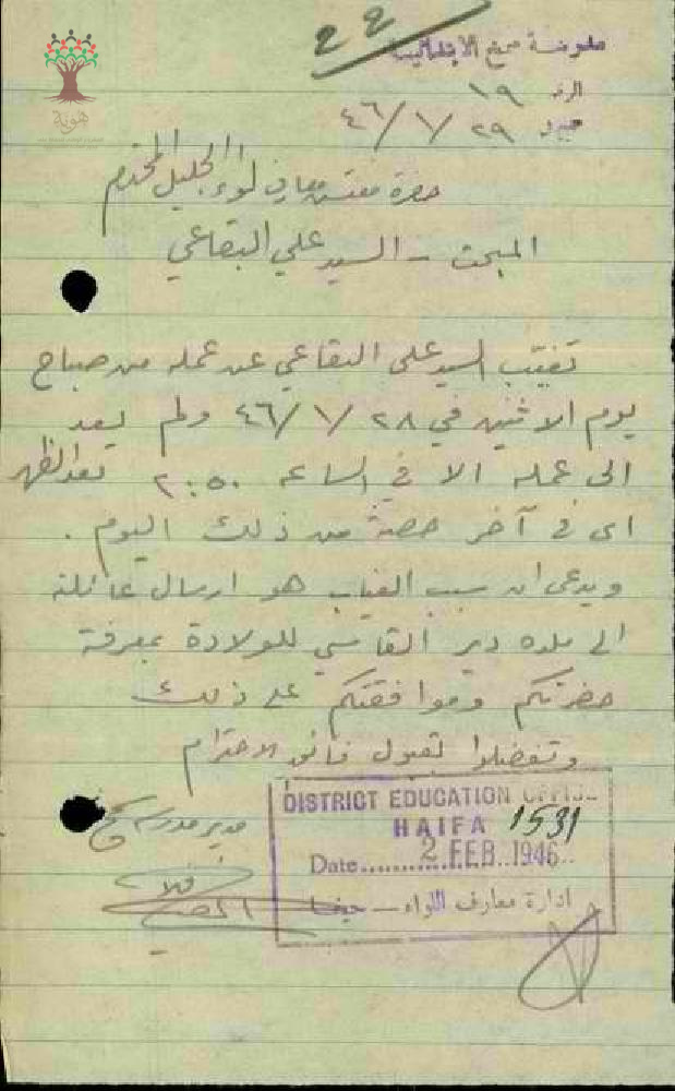 رسالة من مدير مدرسة سمخ الى مفتش المعارف بخصوص تغيب المعلم علي البقاعي عن العمل
