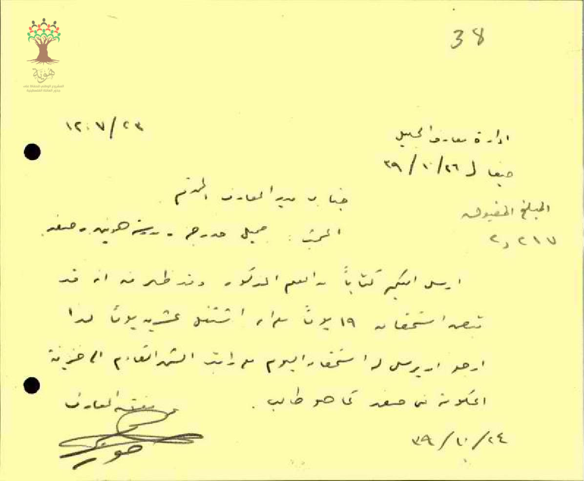 رسالة من مفتش المعارف الى ادارة معارف الجليل جناب مدير معارف المحترم بخصوص استحقاقات المالية للمعلم جميل حدرج