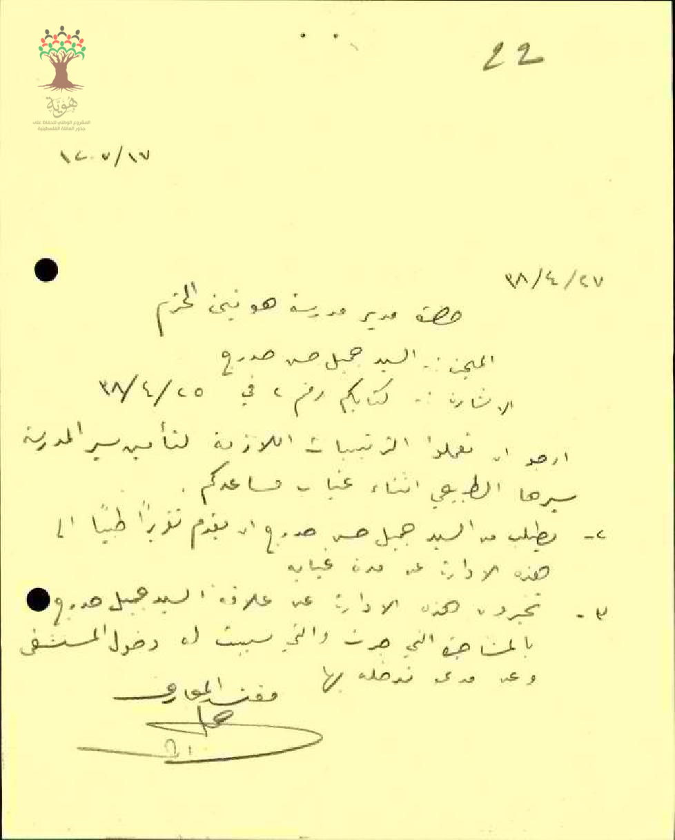 رسالة من مدير المعارف الى حضرة مدير مدرسة هونين المحترم بخصوص تقديم تقرير طبي عن غياب المعلم جميل حدرج
