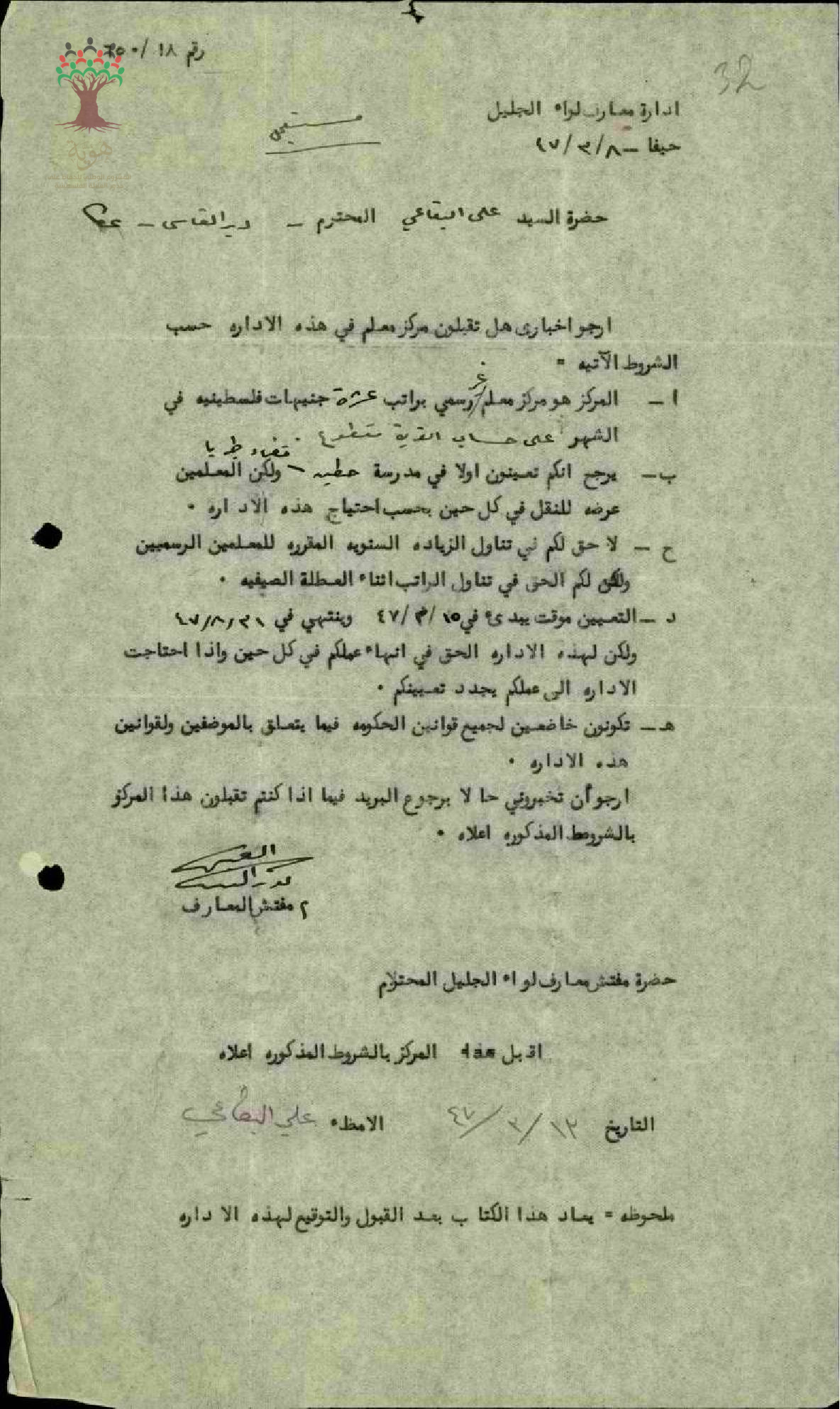 رسالة من مفتش المعارف الى المعلم علي البقاعي يعرض عليه العمل في مدرسة حطين