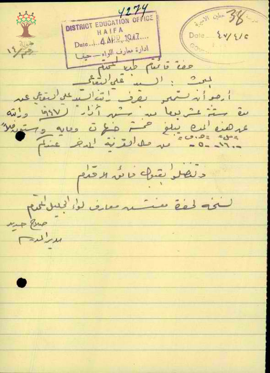 رسالة من مدير مدرسة حطين الى قائمقام طبريا لصرف راتب المعلم علي البقاعي