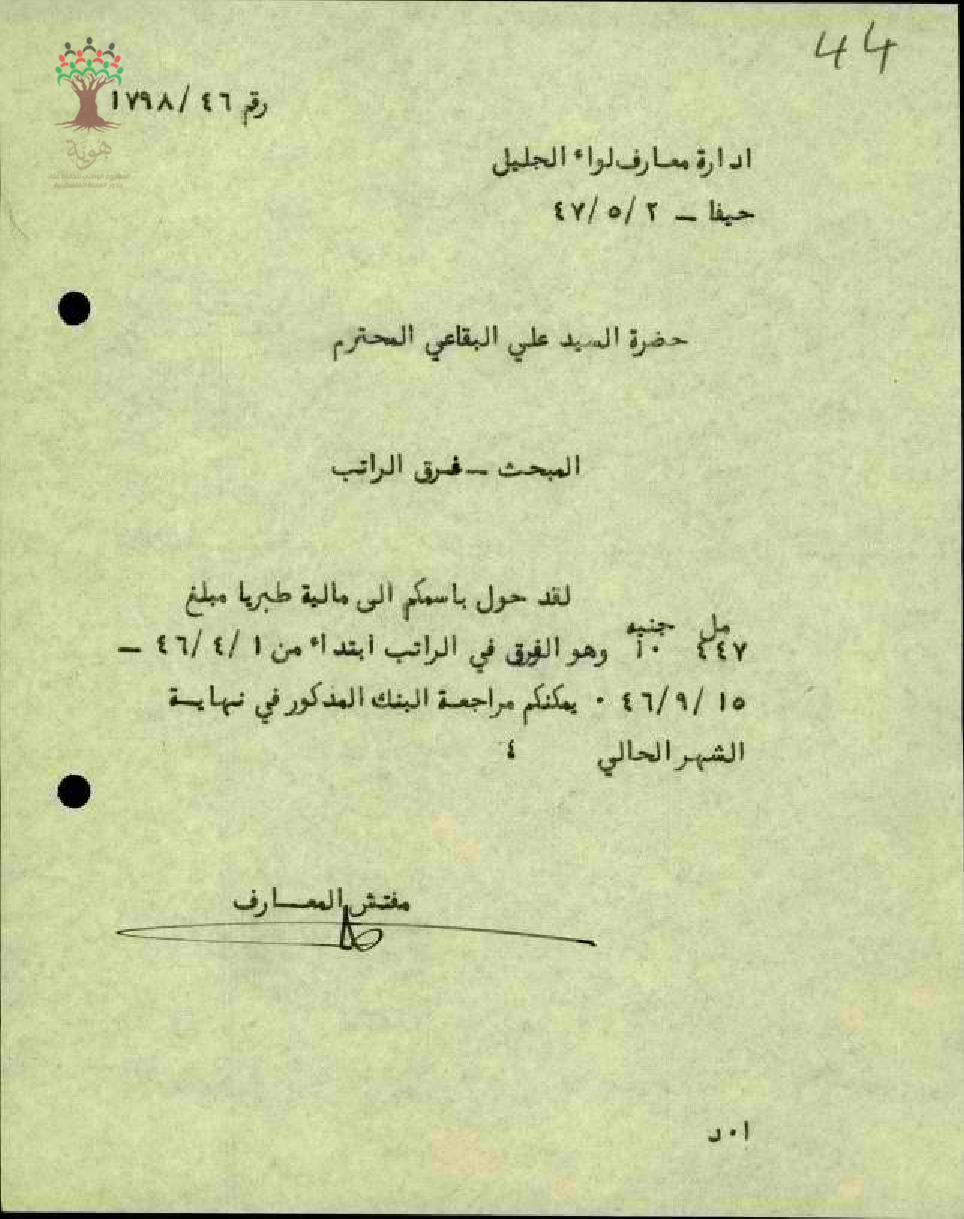 رسالة من مفتش المعارف الى مدير مدرسة حطين بخصوص فرق راتب المعلم علي البقاعي