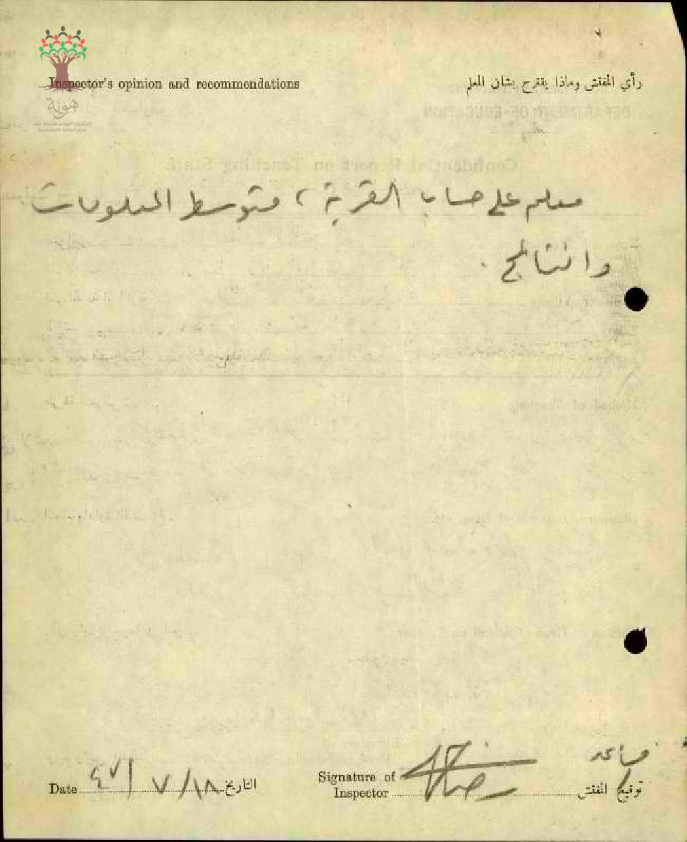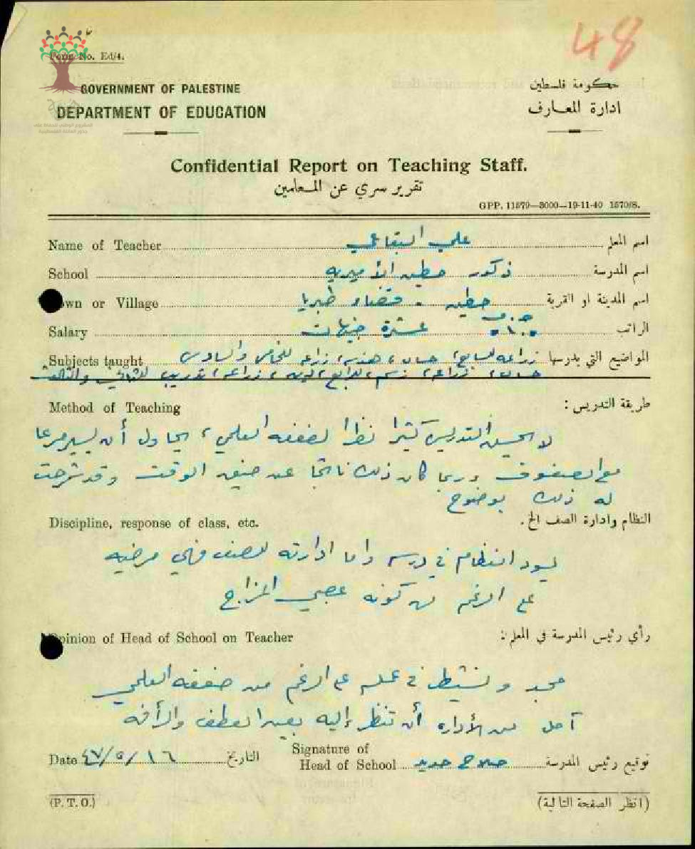 تقرير تفصيلي عن أداء المعلم علي البقاعي في مدرسة حطين سنة 1947