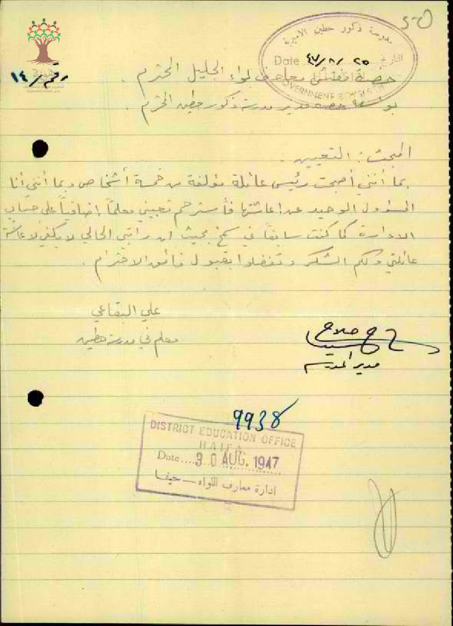 رسالة من المعلم علي البقاعي الى مفتش المعارف يطلب تعيينه على حساب الادارة