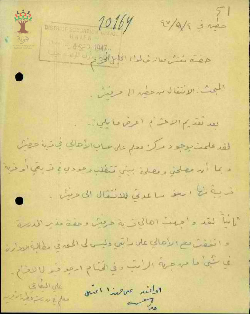 رسالة من المعلم علي البقاعي الى مفتش المعارف يطلب نقله الى حرفيش