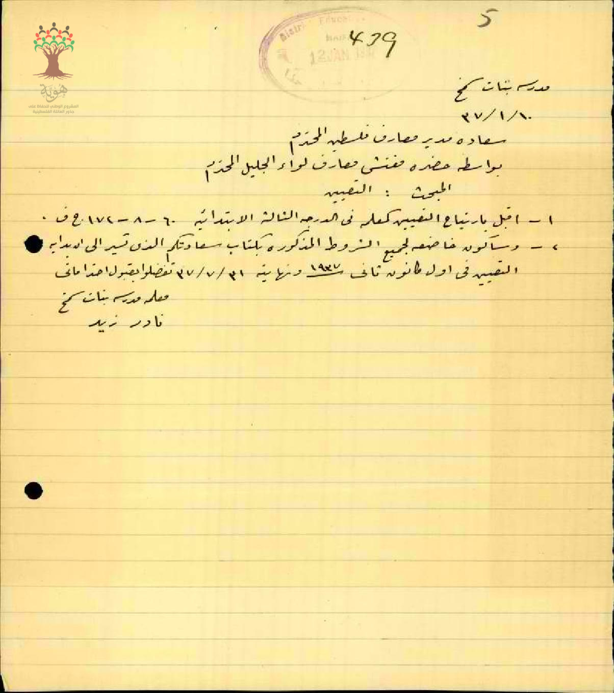 رسالة من المعلمة نادر زيد الى مفتش المعارف بخصوص الموافقة على التعيين
