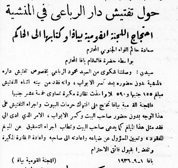 احتجاج على تفتيش دار الرباعي في المنشية - الخبر من الجامعة الاسلامية, 2 أيلول 1936