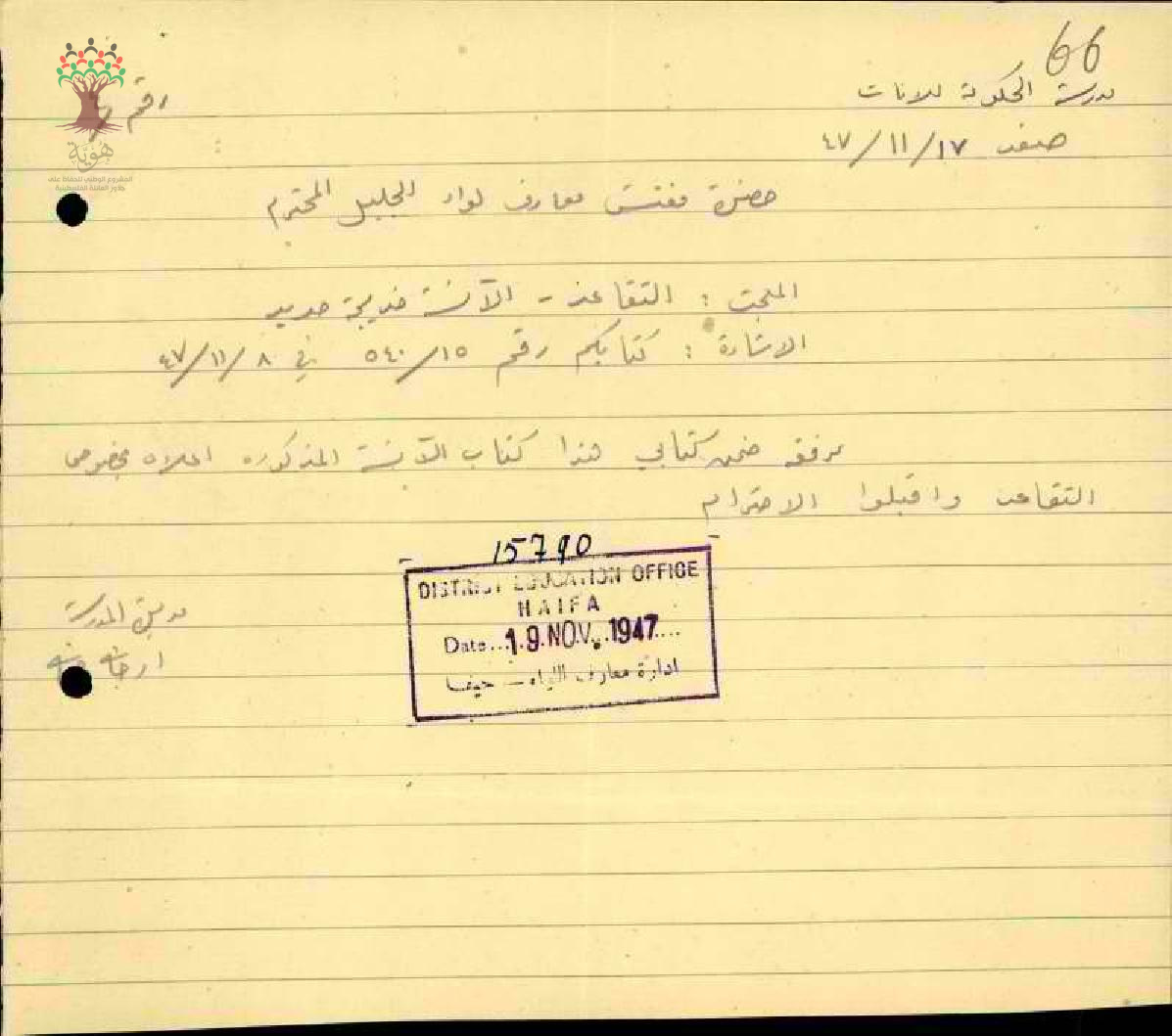 رساله من مدير المدرسه الى مفتش معارف الجليل بخصوص طلب التقاعد المعلمة خديجه محمد حديد