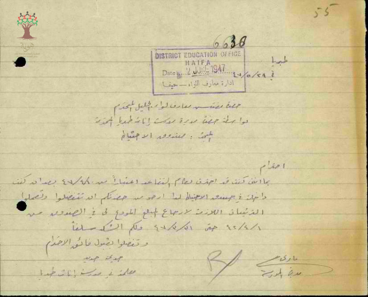 رساله من مدير المدرسه الى مفتش معارف الجليل بخصوص المعلمة خديجه محمد حديد