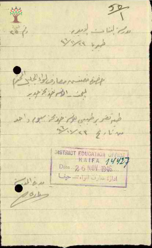 رساله من مدير المدرسه الى مفتش معارف الجليل بخصوص تقرير طبي عن المعلمة خديجة محمد حديد