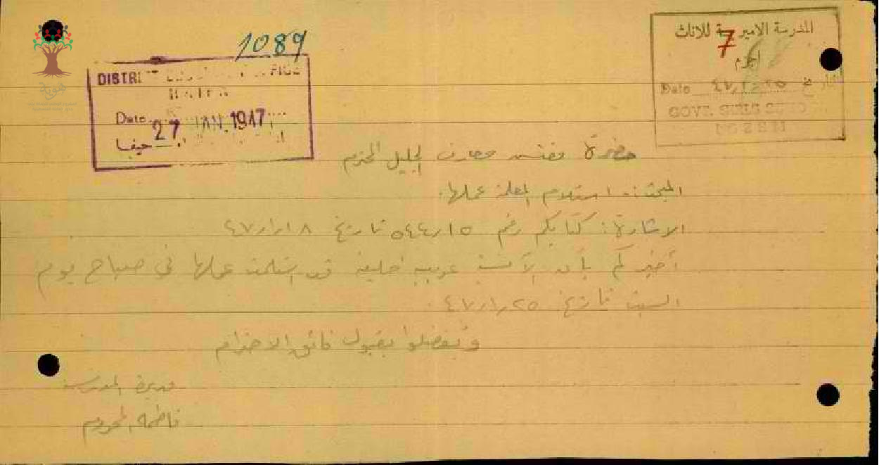 رسالة من مديرة المدرسة فاطمة المحروم الى حضرة مفتش لواء الجليل