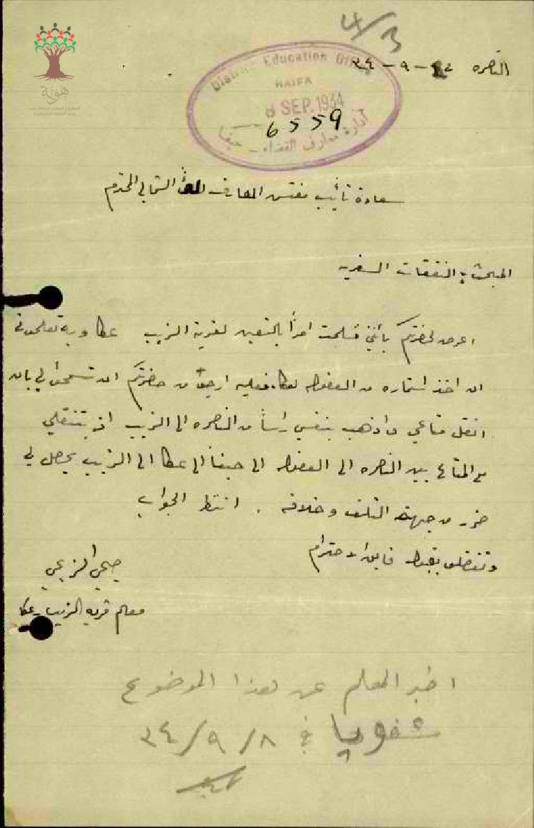 رسالة من المعلم صبحي الزعبي الى نائب مفتش المعارف بخصوص نفقات السفر