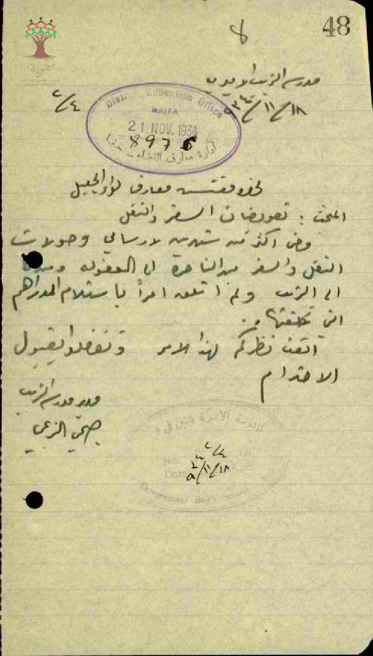 رسالة من المعلم صبحي الزعبي الى مفتش المعارف يبحث معه عدم حصوله على وصولات نقل العفش