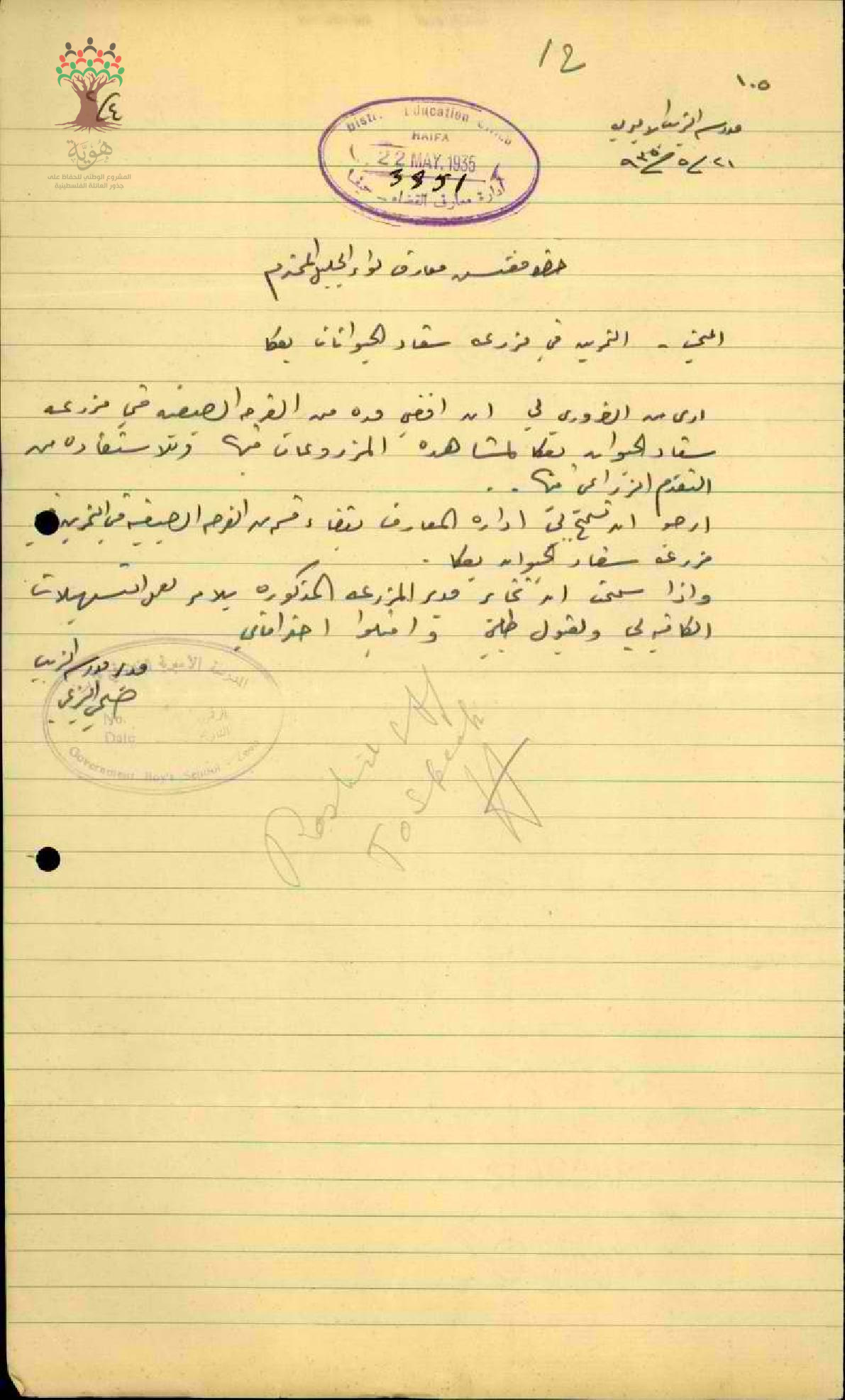 رسالة من المعلم صبحي الزعبي الى مفتش المعارف يطلب فيها التمرين في مزرعة للحيوان