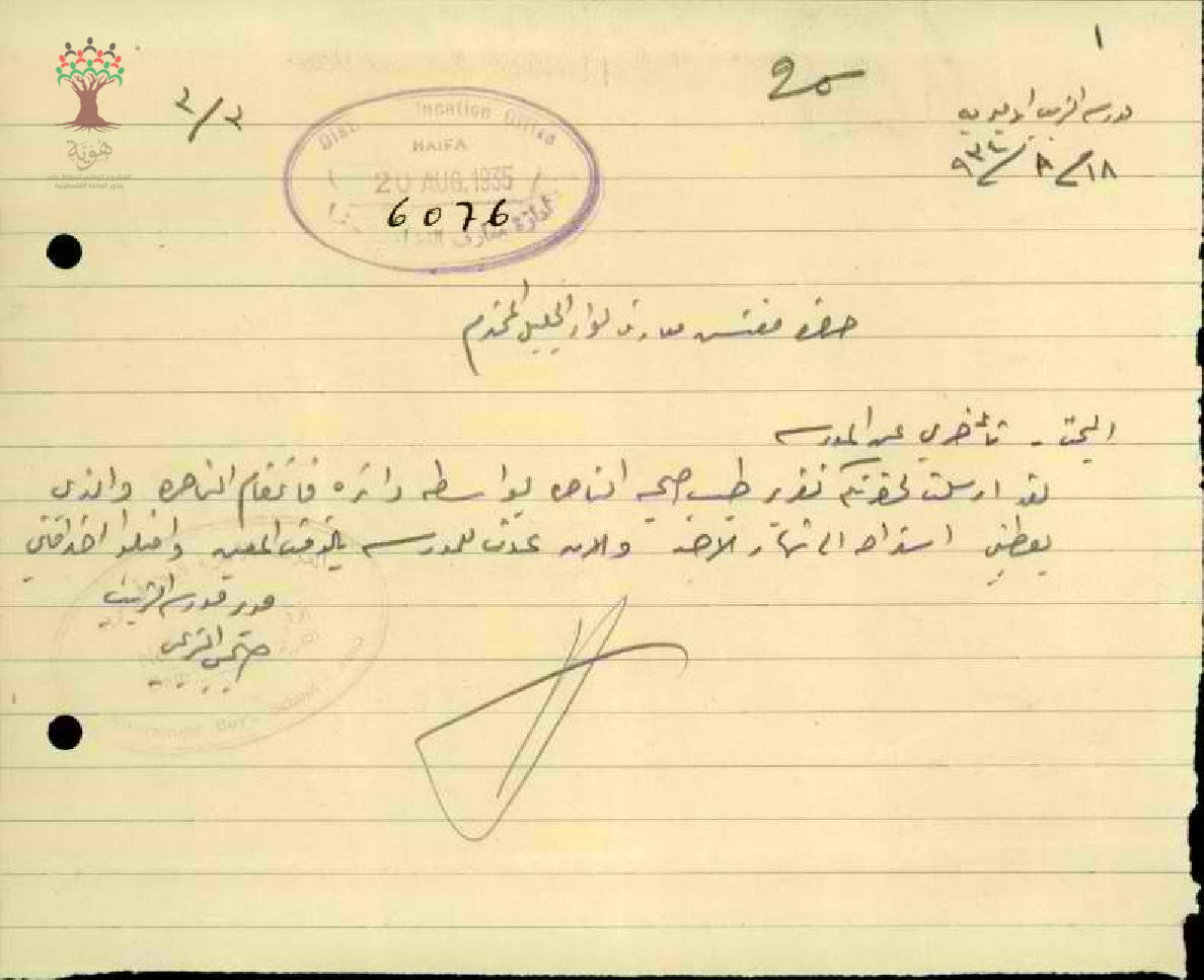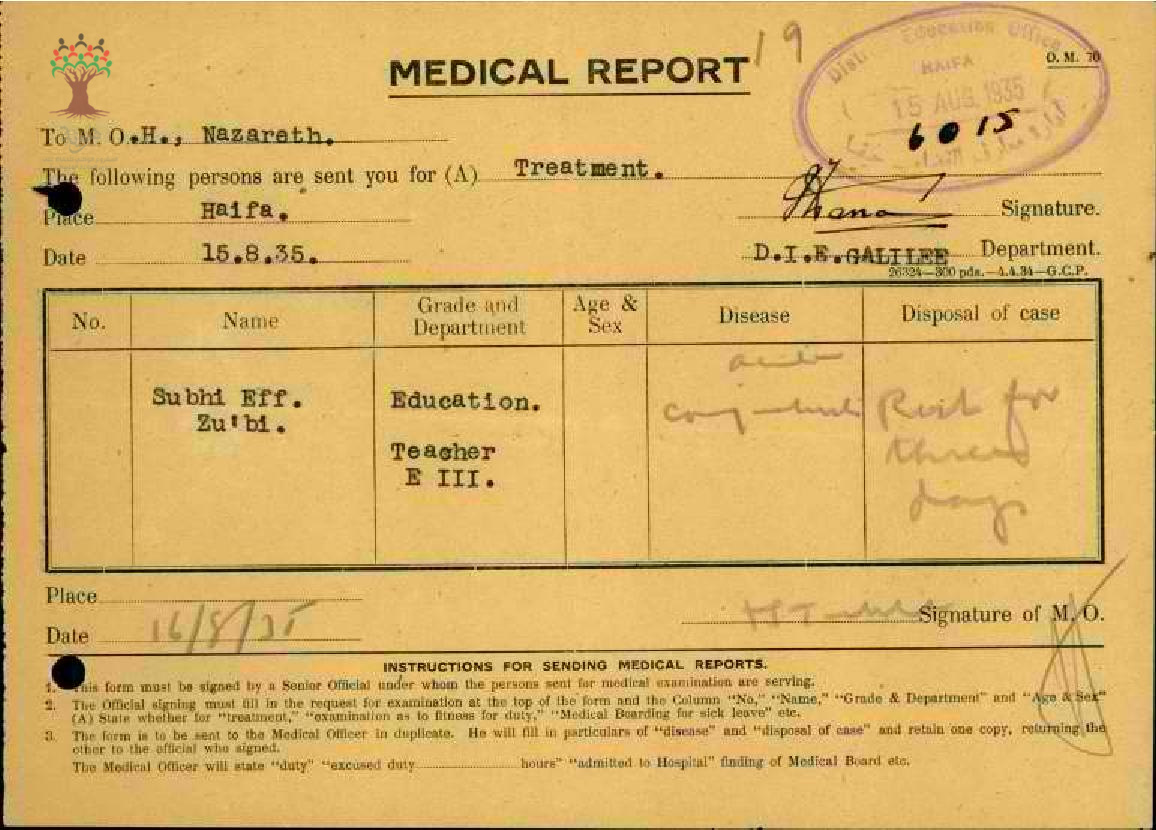 رسالة من المعلم صبحي الزعبي الى مفتش المعارف بخصوص تغيبه عن العمل مرفقة بالتقرير الطبي
