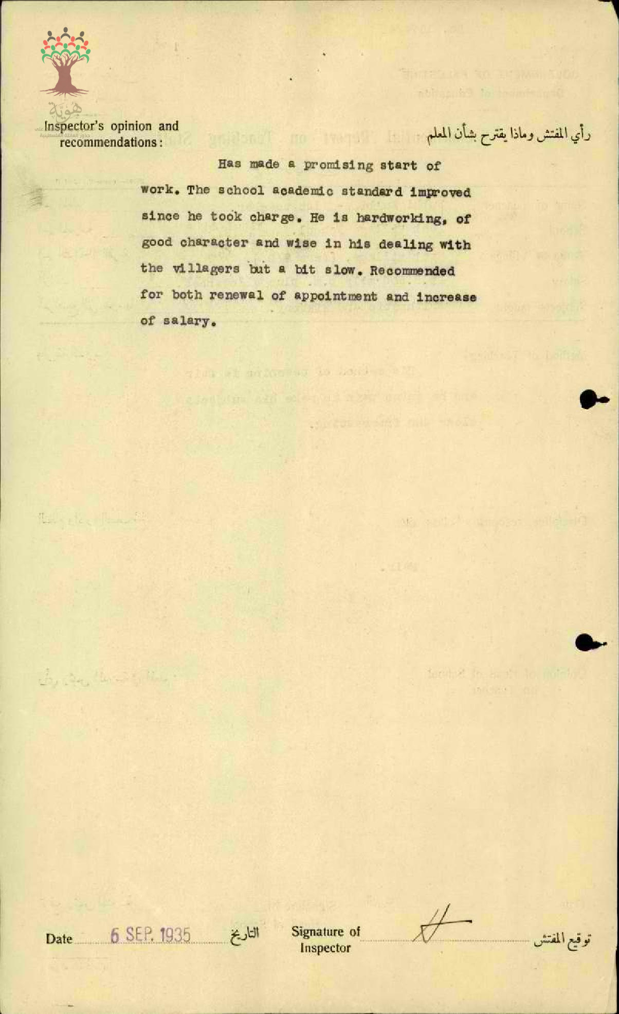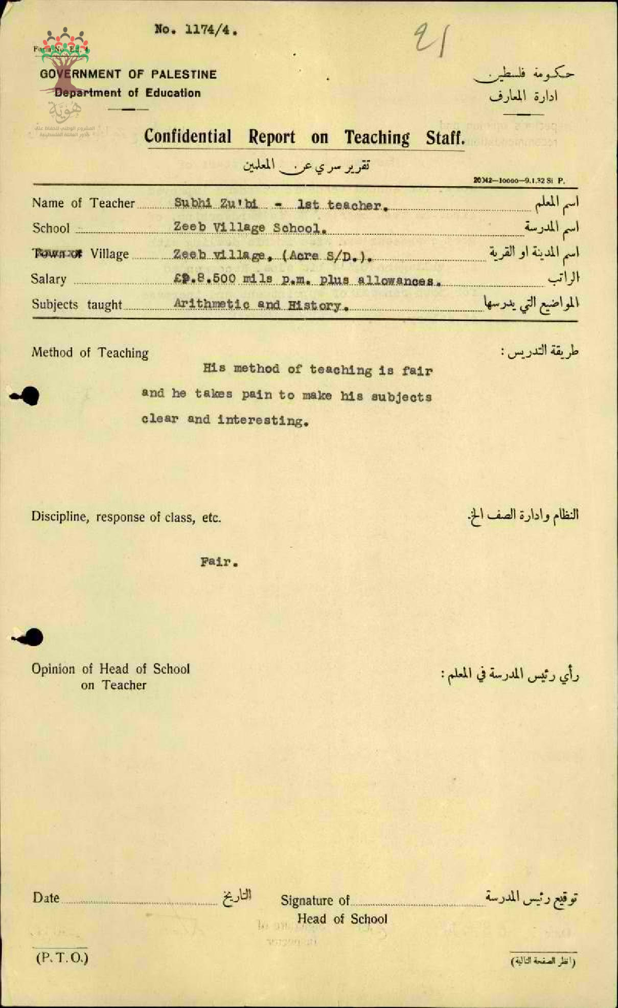 تقرير تفصيلي عن أداء المعلم صبحي الزعبي في مدرسة الزيب سنة 1935