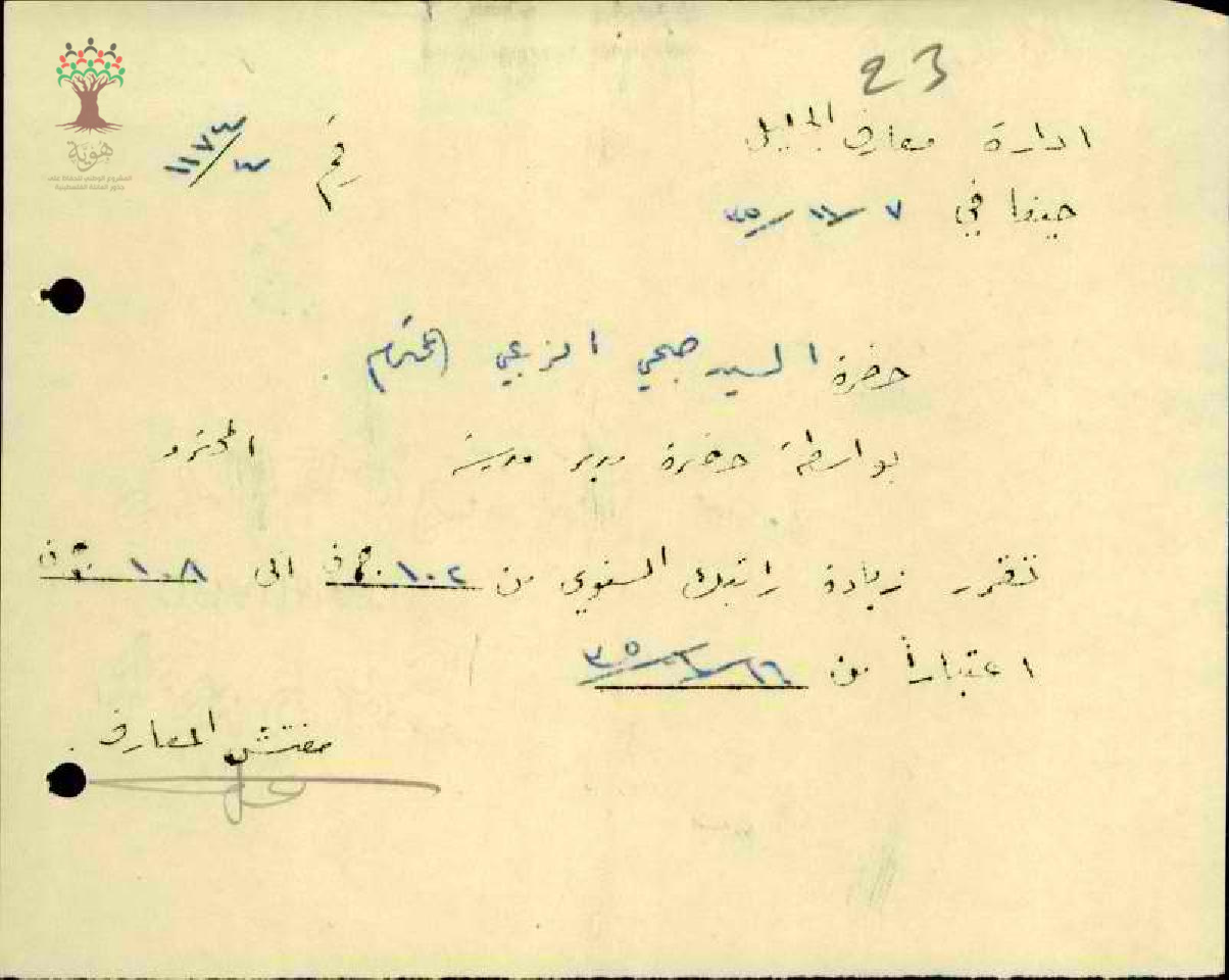 رسالة من مفتش المعارف الى المعلم صبحي الزعبي بخصوص زيادة راتبه