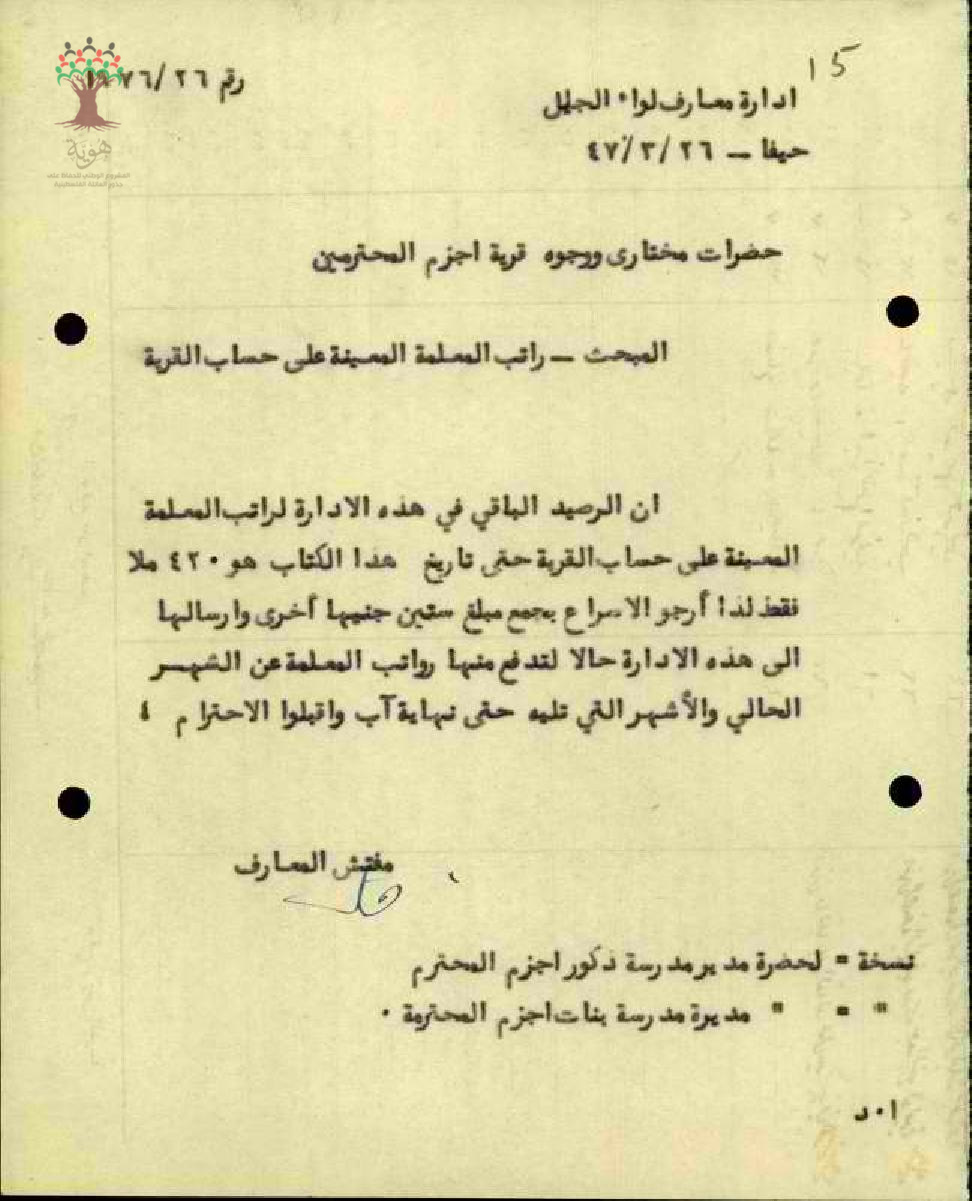 رسالة من مفتش المعارف الى ادارة معارف لواء الجليل حضرات مختارى ووجوه قرية اجزم المحترمين المبحث راتب المعلمة عربية خليفة المعينة على حساب اهل القرية