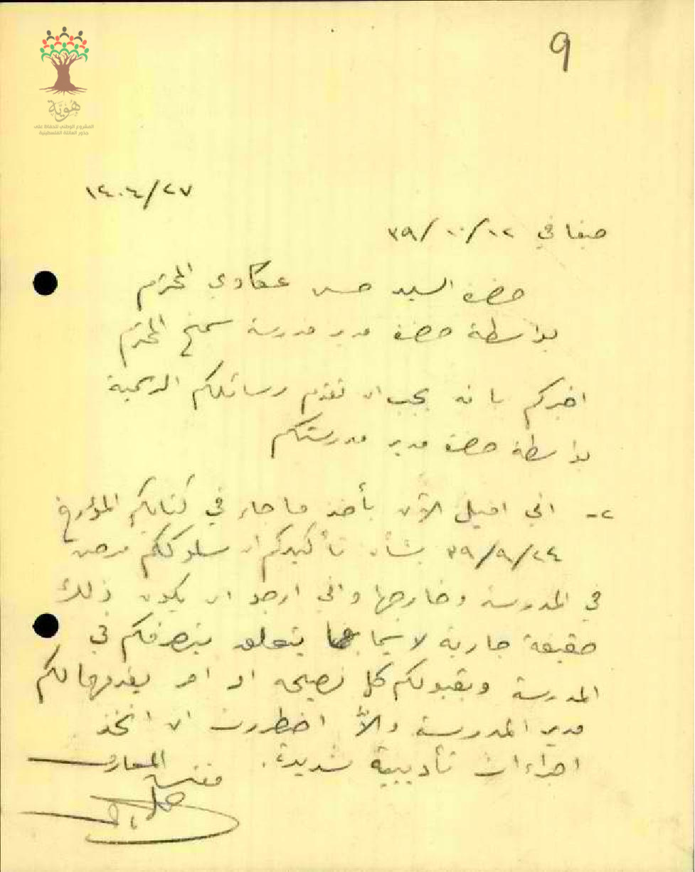رسالة من مفش المعارف الى المعلم حسن عكاوي