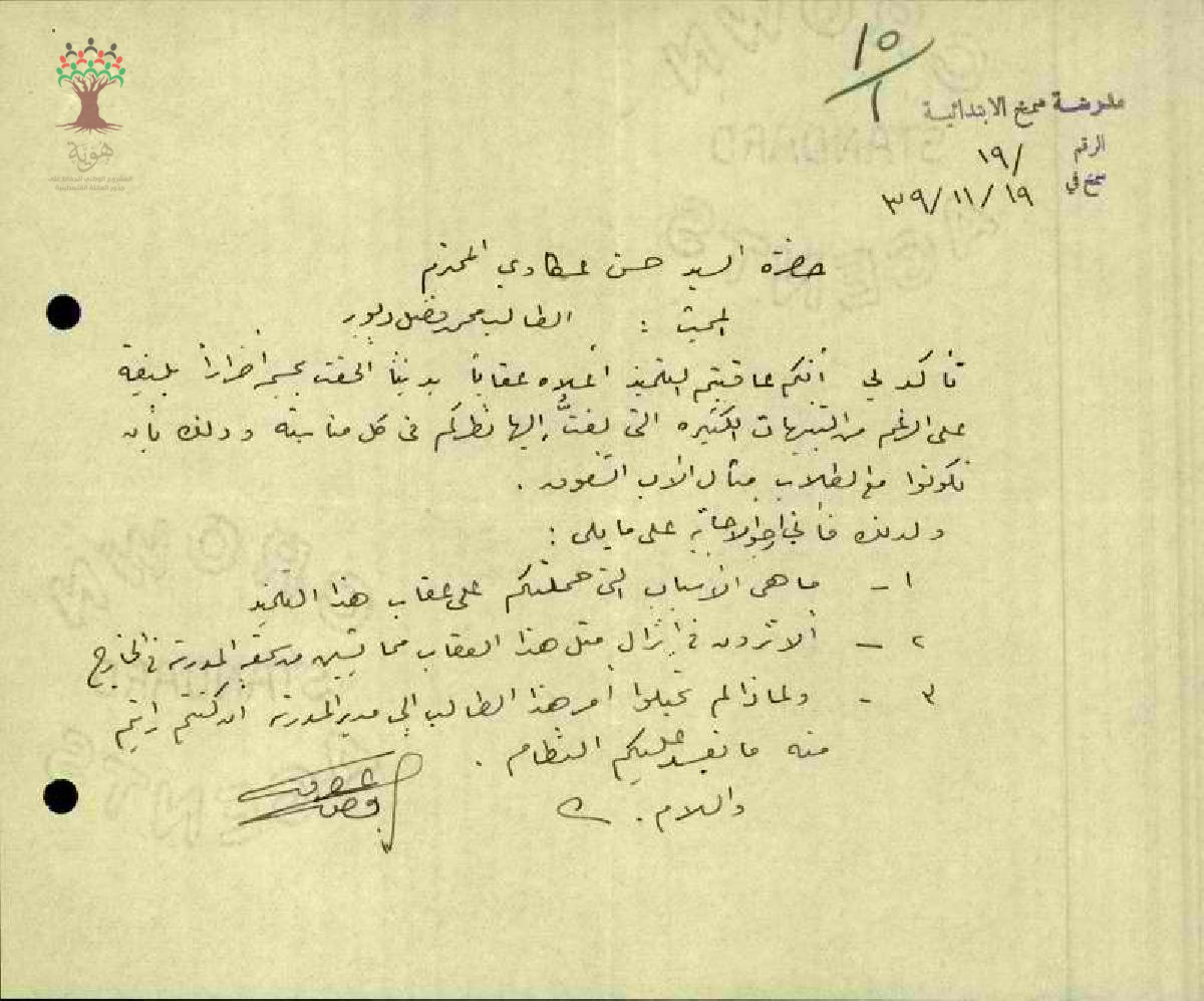 رسالة استفسار حول عقاب طالب بدنياً من قبل المعلم حسن عكاوي
