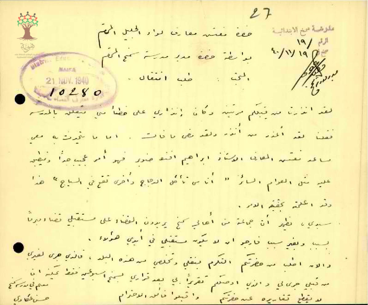 طلب نقل مقدم من المعلم حسن عكاوي من مدرسة سمخ، يوضح فيه الاسباب التي دفعته لطلب نقله من مدرسة سمخ للبنين الى مدرسة اخرى