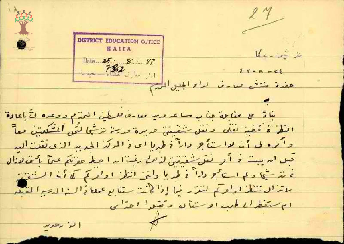 رسالة من المعلمة خديجة حديد الى مفتش معارف الجليل بخصوص نباء على مقالة جناب مساعد مدير معارف فلسطين المحتلرم ووعده لى باعادة النظر في قضية النقل