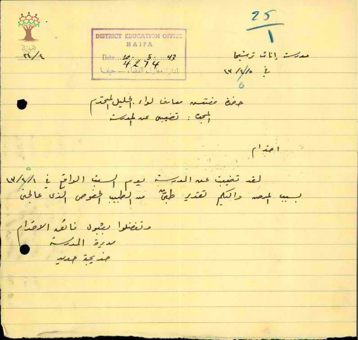 رسالة من المعلمة خديجة حديد الى مفتش معارف الجليل بخصوص الغيب عن المدرسة بسبب المرض واليكم التقرير الطبي من الطبيب الخصوصي الذي عالجني
