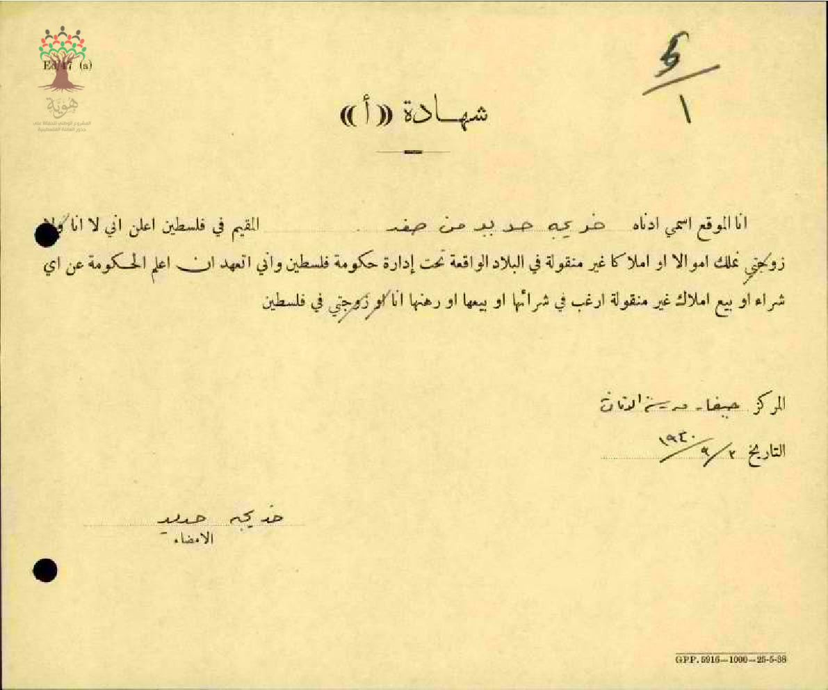 شهادة بخصوص المعلمة خديجة انها لا تملك لا هي ولا زوجها اموال او املاك غير منقولة في البلاد الواقعة تحت ادارة حكومة فلسطين وانها تتعهد بالحديث للحكومة عن اي شراء او بيع املاك غير منقولة ارغب في شرائها او بيعيها او رهنها