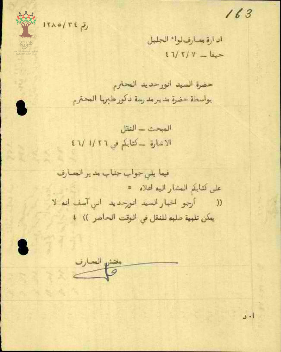 رسالة من مفتش المعارف الى ادارة معارف الجليل بخصوص اخبار المعلم انور حديد انه لا يمكن تلبية طلبة للنقل