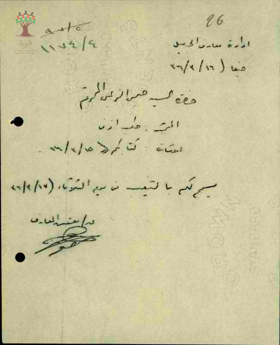 رسالة من مفتش المعارف الى المعلم صبحي الزعبي يسمح له بالتغيب عن العمل