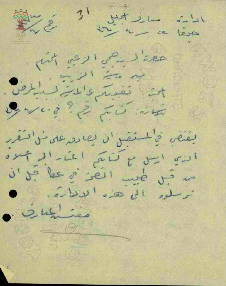 رسالة من مفتش المعارف الى المعلم صبحي الزعبي بخصوص المصادقة على التقرير الطبي من قبل طبيب الصحة