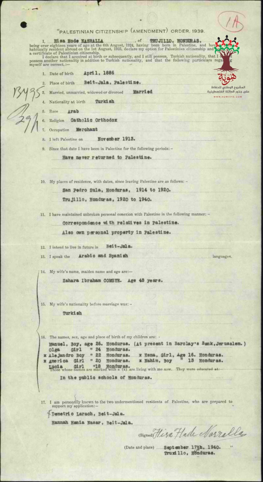وتظهر تعليقات دائرة الهجرة على هذا الطلب، الذي قُدم بينما كان مقيماً في هندوراس، أنه كان لا يزال يحافظ على روابط مباشرة مع فلسطين، بما في ذلك تواصله المستمر مع والدته ووالدة زوجته، وملكيته لبيت مكون من خمس غرف وأراضٍ بقيمة 200 جنيه إسترليني في بيت جالا. وقد حصل الجد عيسى نصر الله على شهادته الفلسطينية في 18 ديسمبر 1942.
