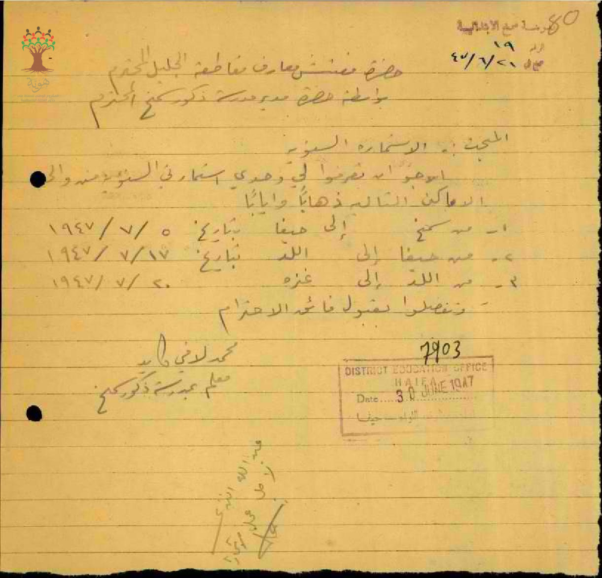 رسالة من المعلم محمد كايد الى مفتش المعارف يطلب فيها استمارة سفره السنوية
