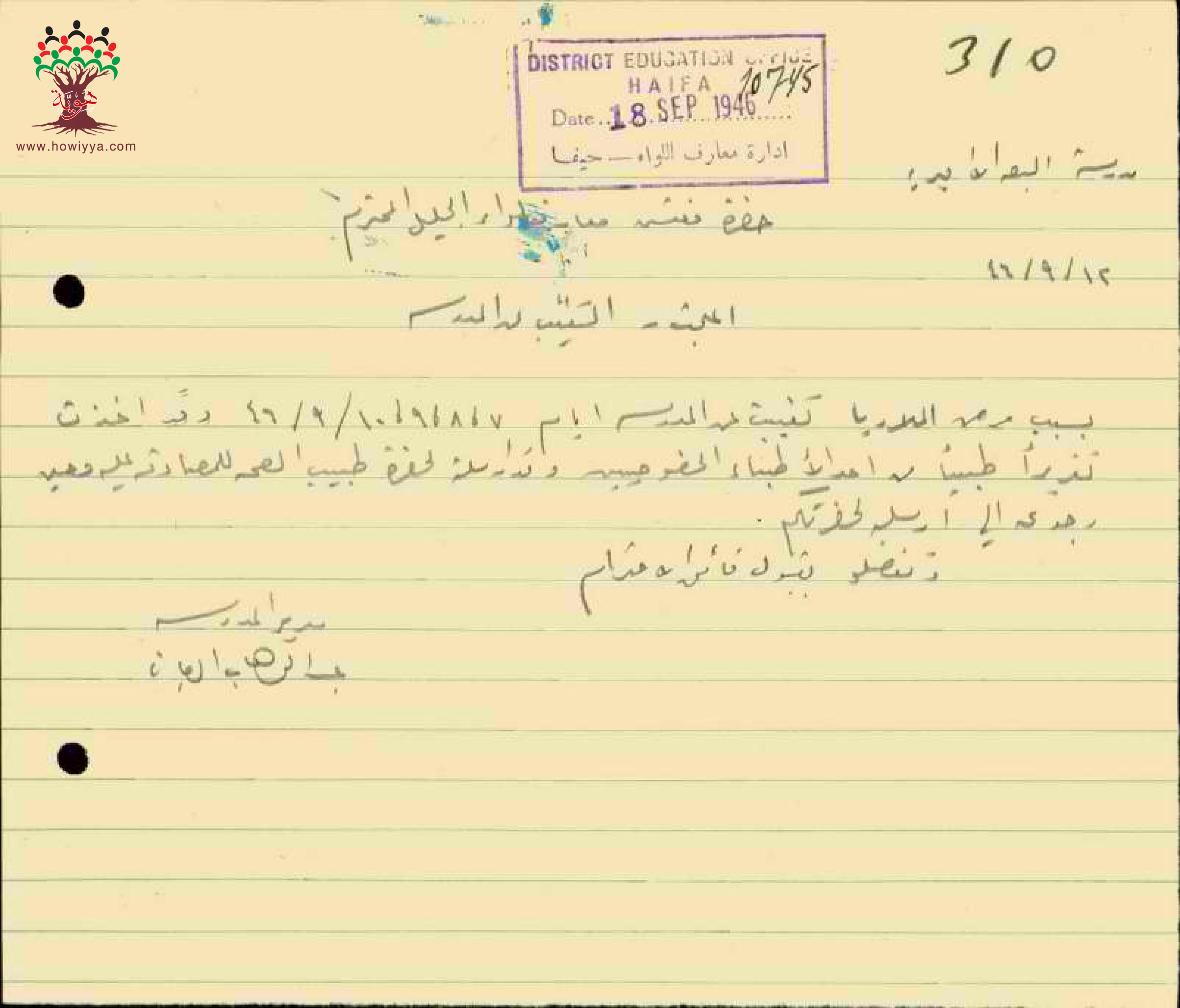 رسالة من المعلم عبد الوهاب الدجاني الى مفتش المعارف بخصوص تغيبه عن العمل بسبب مرضه بالملاريا