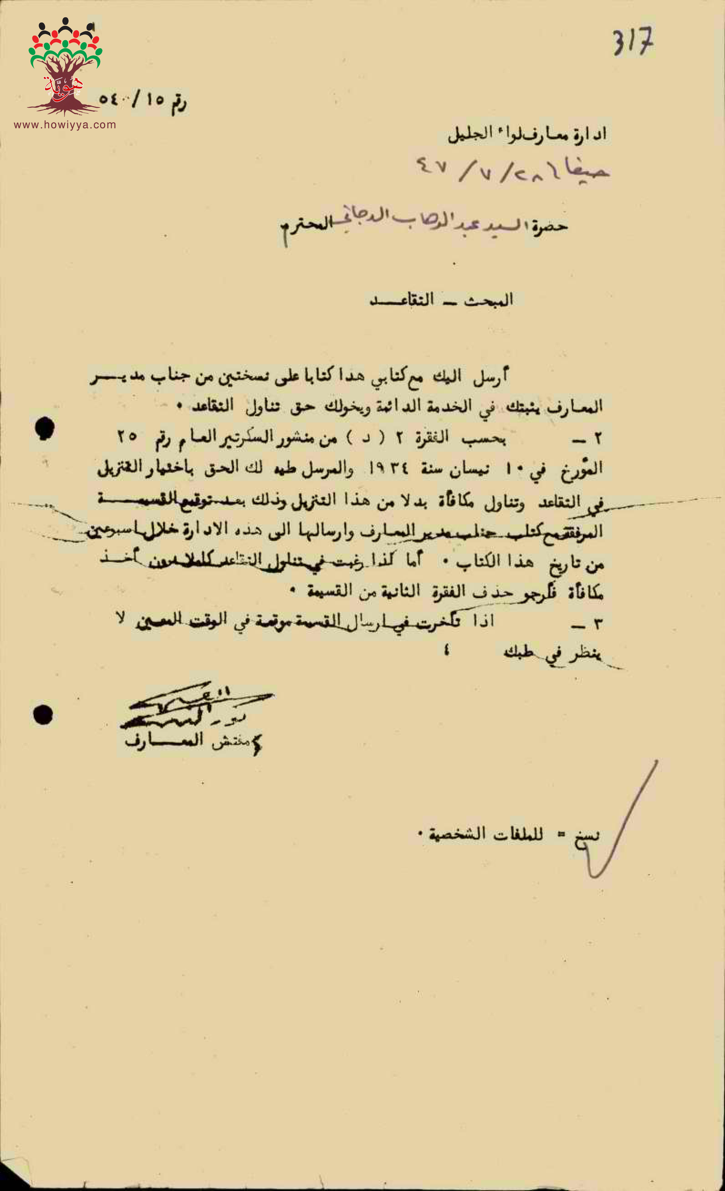 رسالة من مفتش المعارف الى المعلم عبد الوهاب الدجاني بخصوص حقه في تناول التقاعد