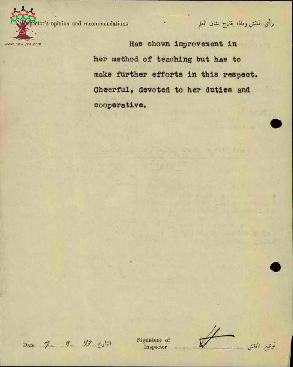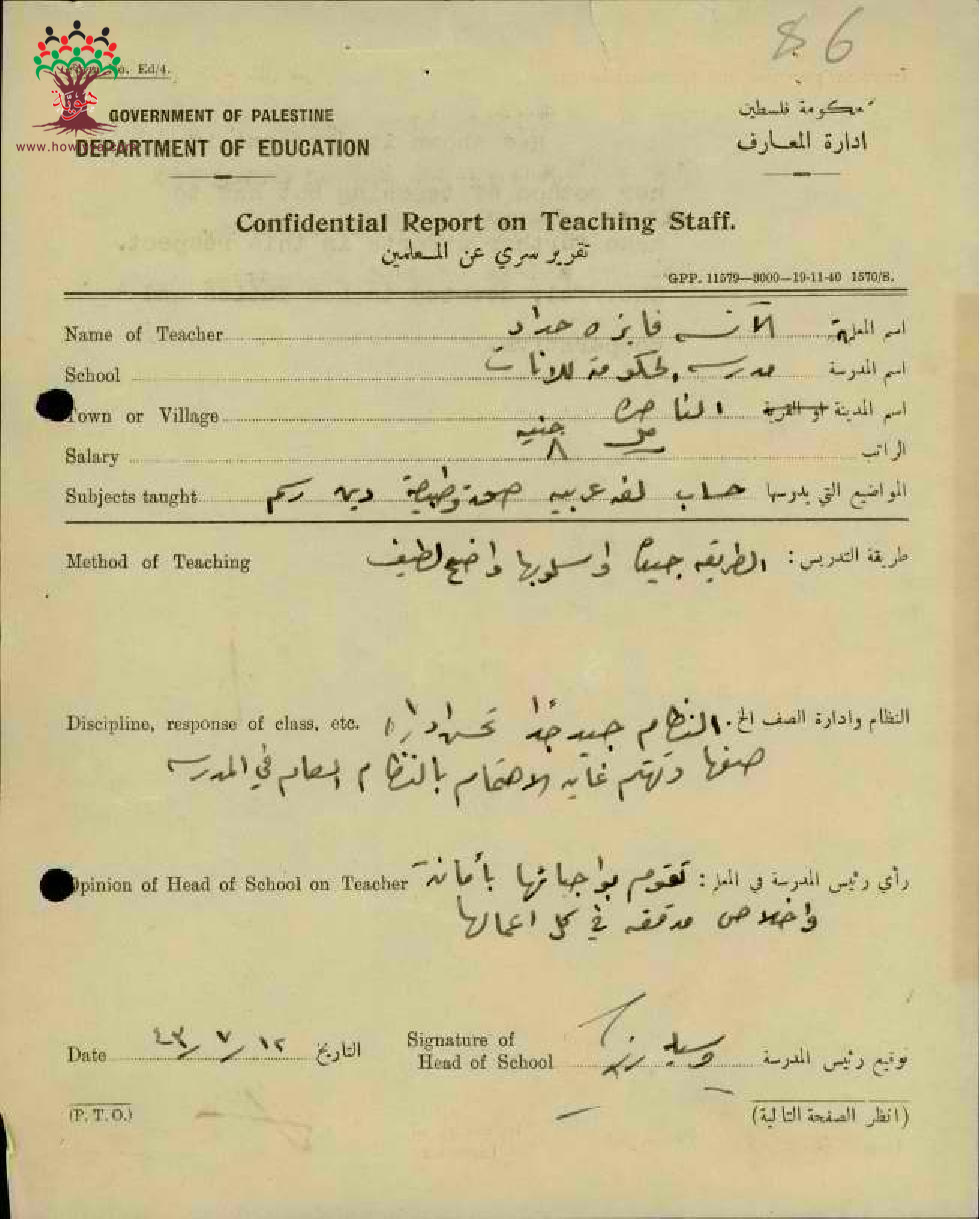تقرير تفصيلي عن أداء المعلمة فايزة اسكندر حداد في مدرسة الناصرة سنة 1943