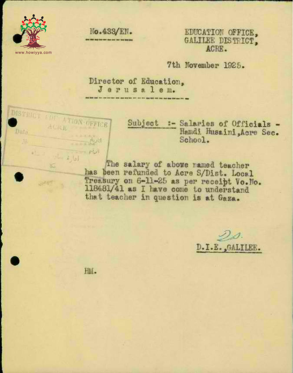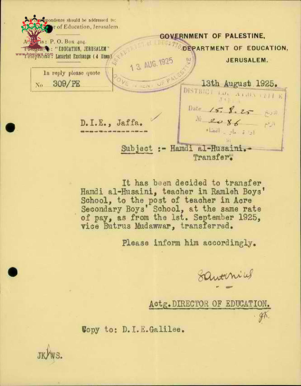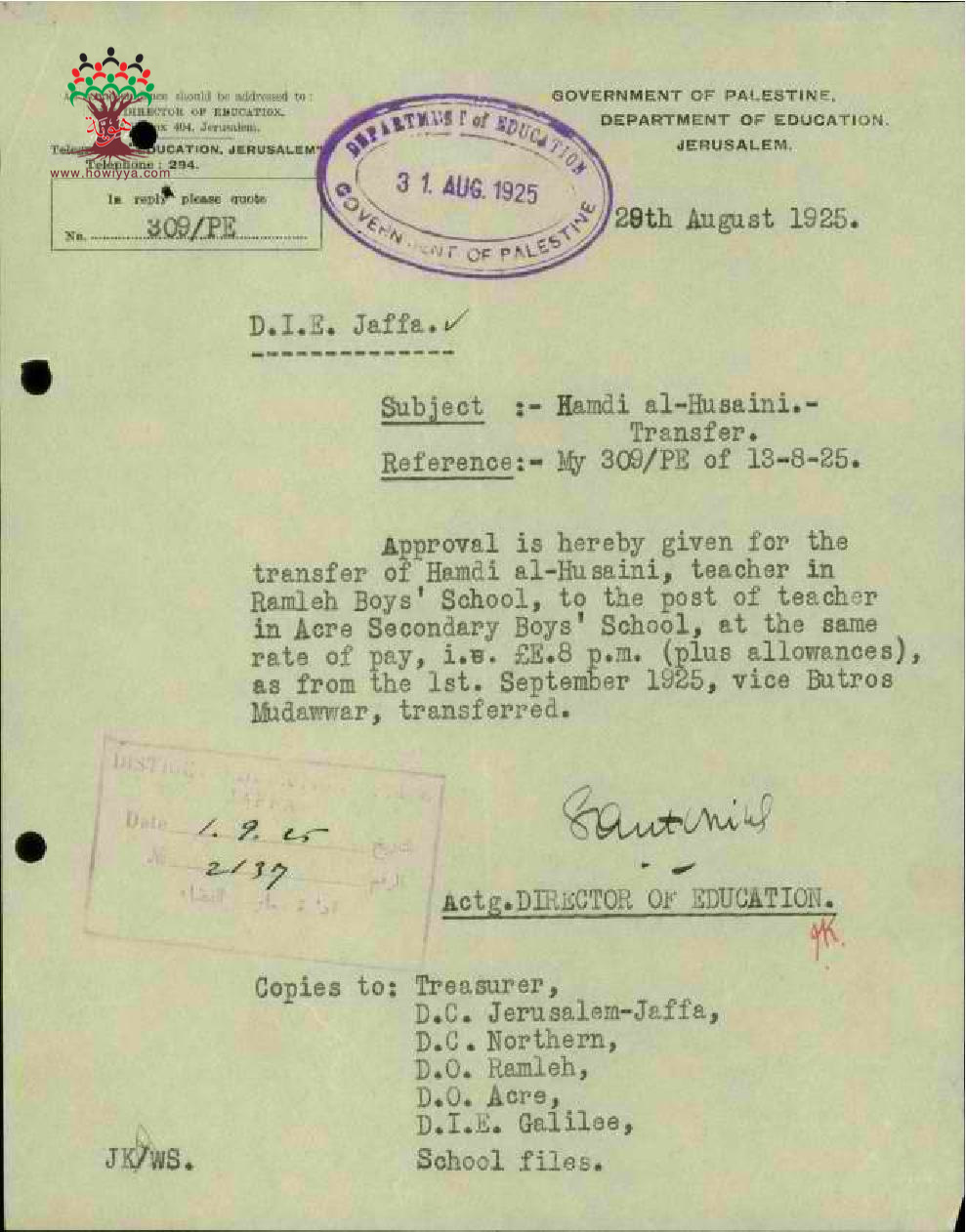 مجموعة رسائل بخصوص نقل المعلم حمدي الحسيني من مدرسة الرملة الى مدرسة ثانوية عكا