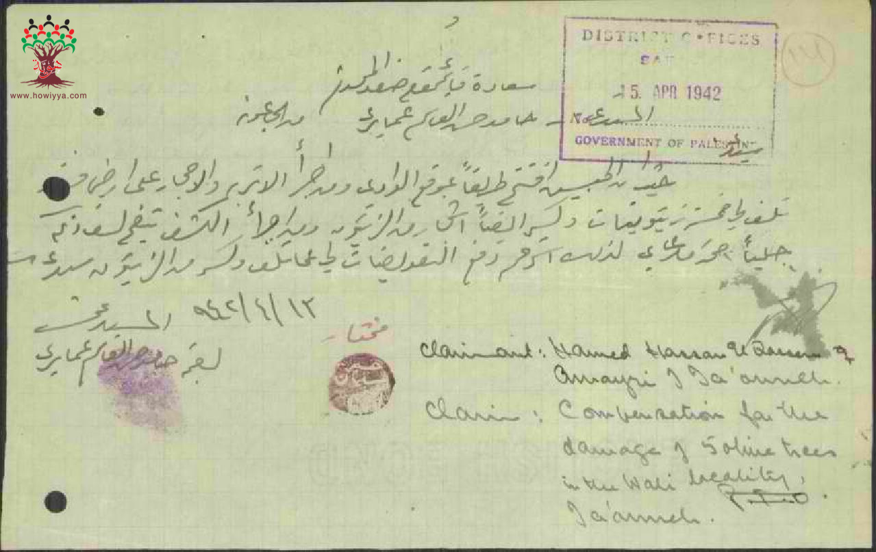 طلب تعويض مقدم من حامد حسن القاسم عمايري بسبب اتلاف شجر الزيتون-الجاعونة