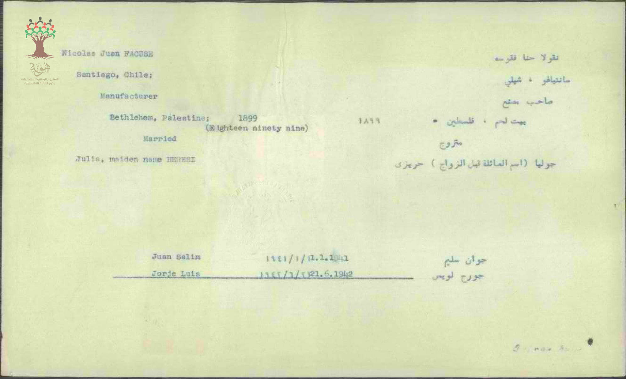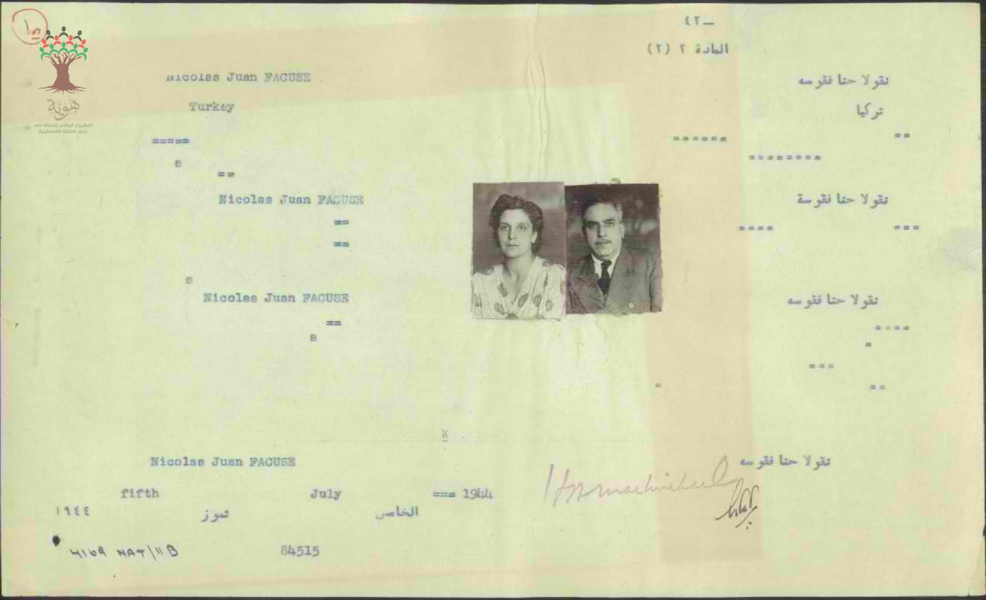 ورقة بيانات نقولا فقوسة المرفقة بطلب الجنسية وزوجته جوليا حريزي