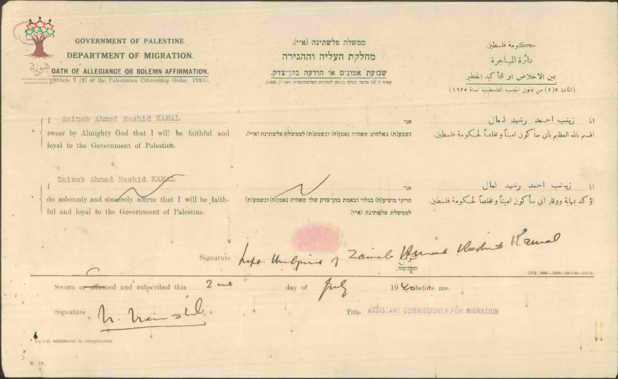 زينب أحمد رشيد كمال(ملص)توقع على(يمين الاخلاص)للحصول على الجنسية الفلسطينية