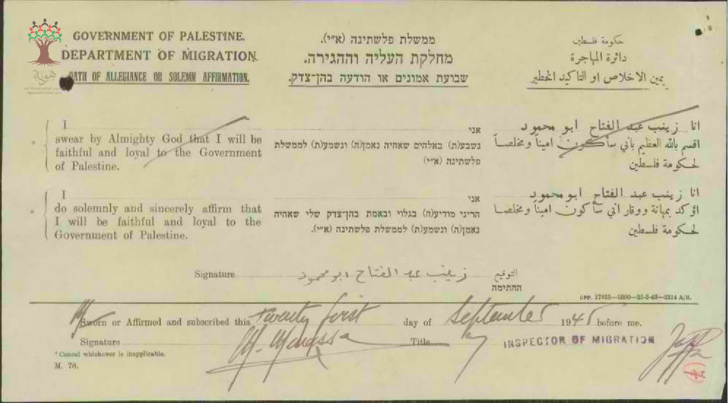 زينب أبو محمود توقع على (يمين الإخلاص) للحصول على الجنسية الفلسطينية