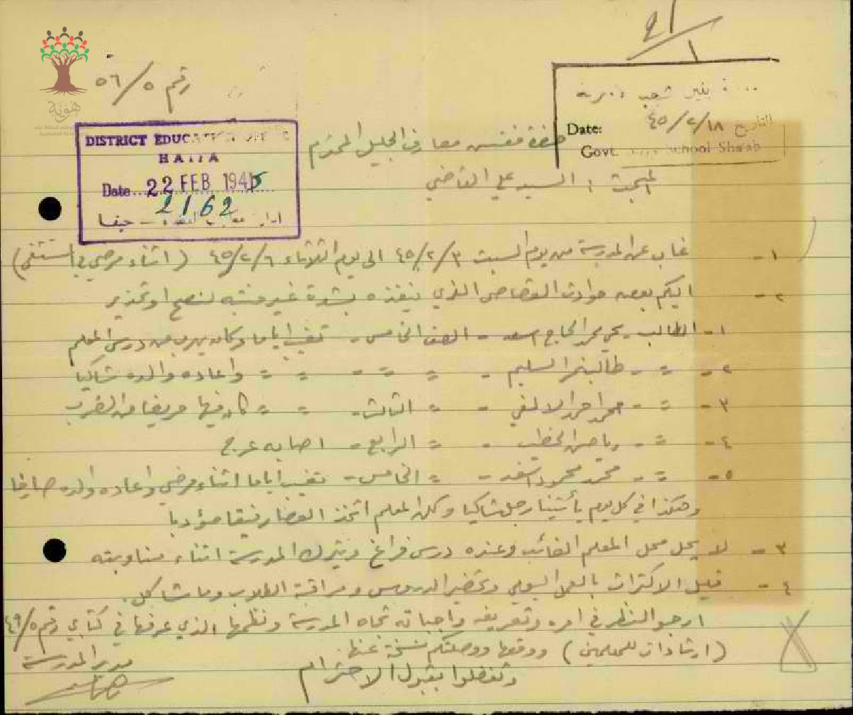 رسالة من مدير مدرسة شعب إلى مفتش المعارف بخصوص المعلم علي القاضي وحوادث القصاص الذي ينفذها