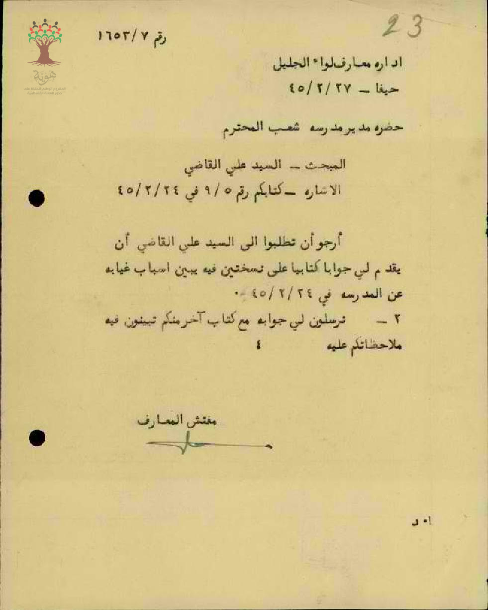 رسالة من مفتش المعارف إلى مدير مدرسة شعب يطلب من المعلم علي القاضي أن يقدم جوابا يبين سبب غيابه