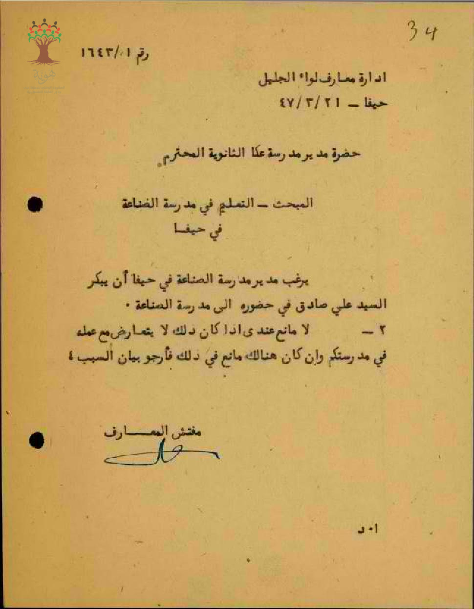 رسالة من مفتش المعارف الى مدير مدرسة عكا بخصوص دوام المعلم علي رستم في مدرسة الصناعة في حيفا