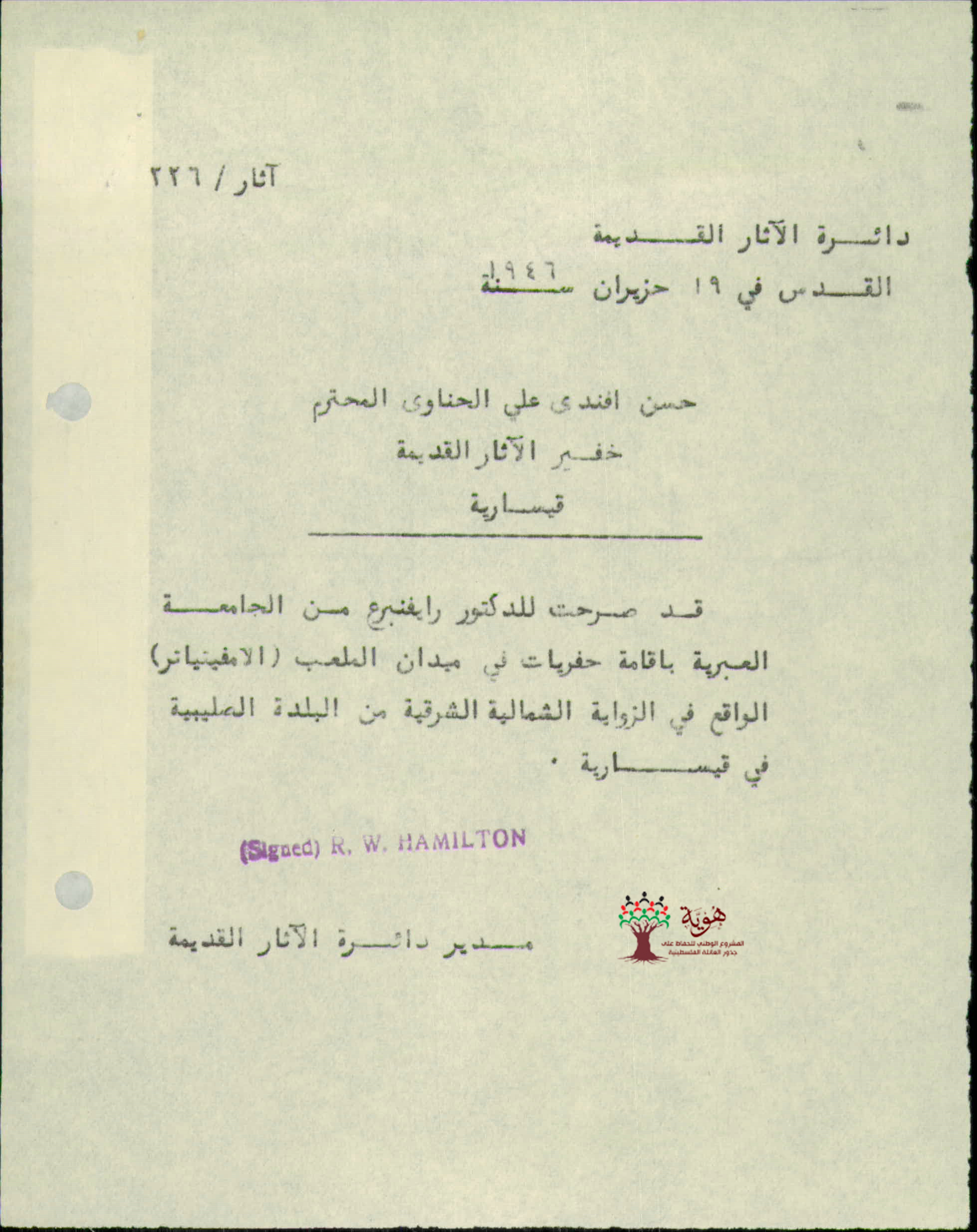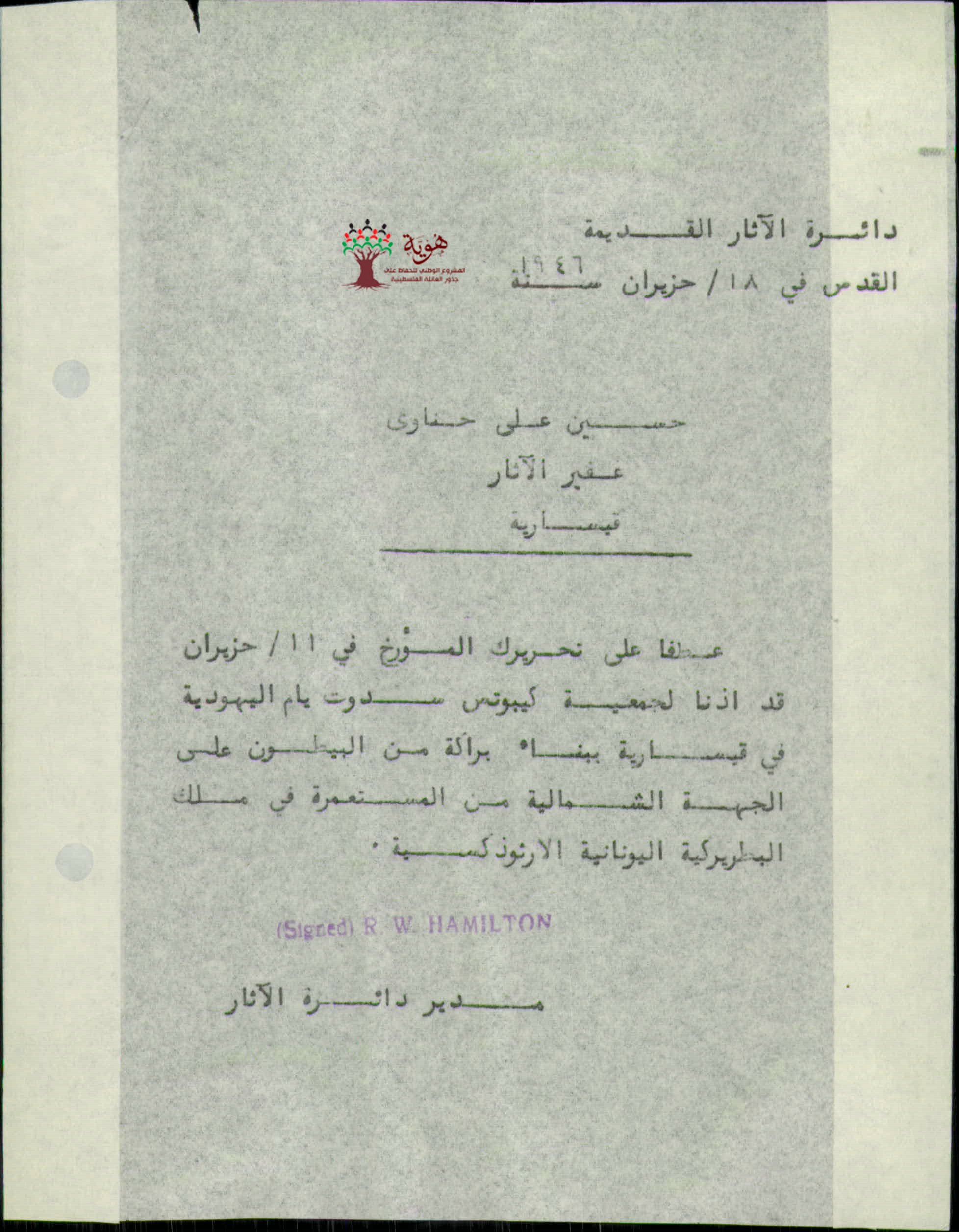 رسالة من الغفير حسن الحناوي لمدير الآثار عن عمليات البناء في كيبوتز قيسارية - 1946 والرد عليها من قبل الدائرة بالسماح لليهود بالبناء