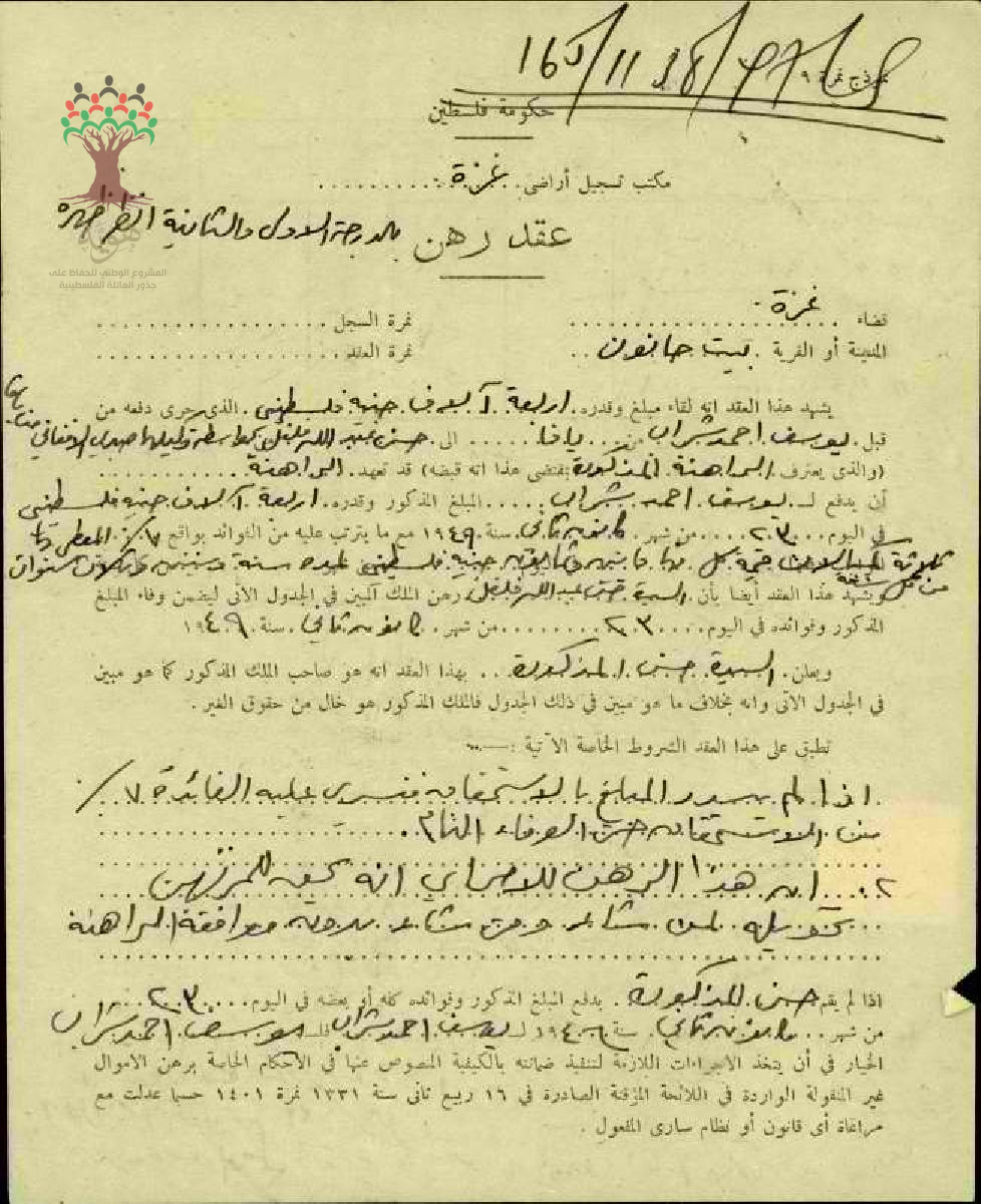 عقد رهن أرض في بيت حانون: مقابل 4000 جنيه فلسطيني يدفعها يوسف أحمد شراب للسيدة حسن فلفل عبر ابنها صبري الأفغاني