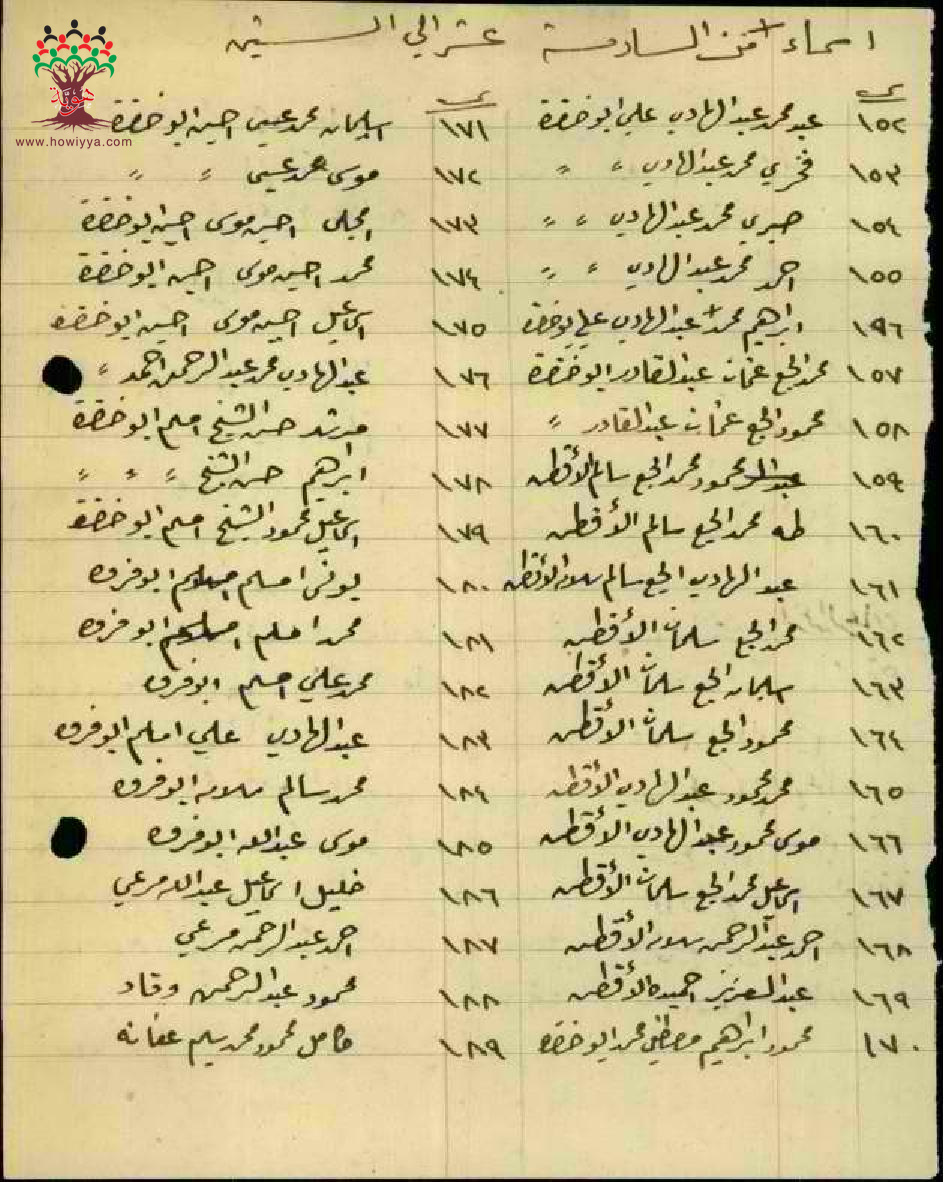 جدول يحتوي على اسماء رجال الدوايمة من عمر 16 سنة حتى 60 سنة - عام 1944 / القائمة من إعداد المختار سلمان أحمد الزعاترة