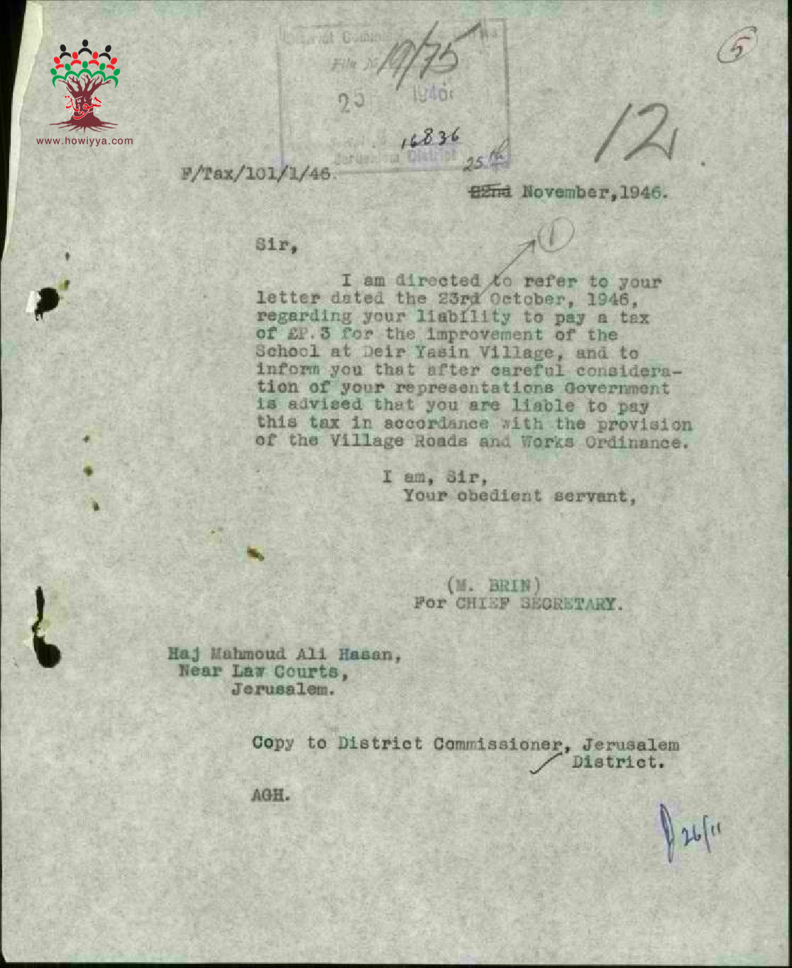 الطلب من الحاج محمود علي حسن دفع ضريبة تحسين مدرسة دير ياسين - بحيث قدم المذكور طلباً لإعفائه من دفع هذه الضريبة لأنه يسكن في القدس وليس له أبناء يتعلمون في بلدته دير ياسين ولكن تم رفض طلبه وإلزامه بدفع الضريبة