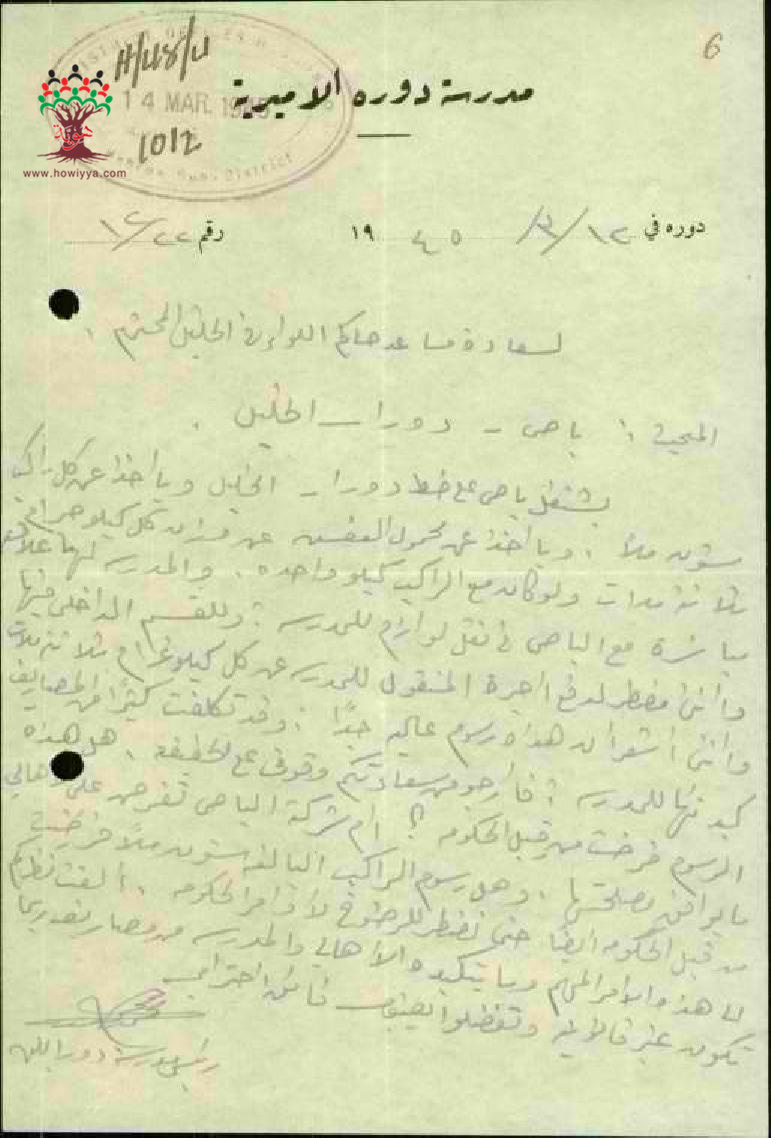 رسالة من مدير مدرسة دورة الى مساعد حاكم اللواء في الخليل يشتكي من رسوم النقل عبر باص دورة ويسأل ان كانت هذه التكاليف قد فرضت من قبل الحكومة أو من قبل شركة الباصات