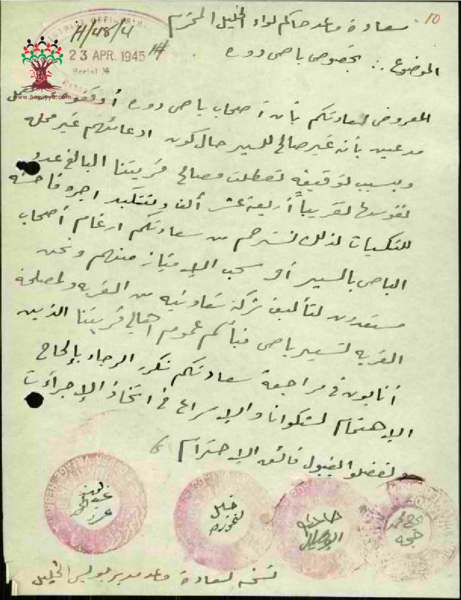 رسالة من مخاتير قرية دورة الى مساعد حاكم لواء الخليل يشتكون فيها على أصحجاب باص دورة بحيث أنهم قاموا بإيقافه عن السير مما يكلف لاالقرية تكاليف كبيرة للنقل عبر السيارات